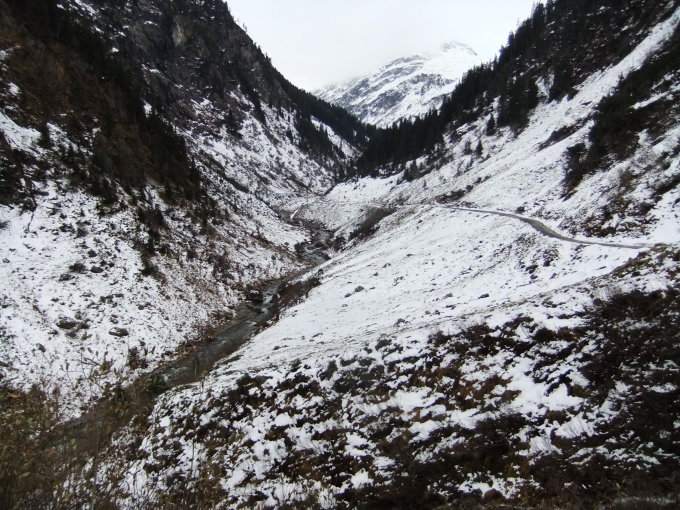 Das Abzweigschild zur Darmstädter Hütte hinter der Verwallalpe oberhalb der Brücke ist vom Pfahl heruntergefallen und vom Schnee verdeckt.
