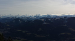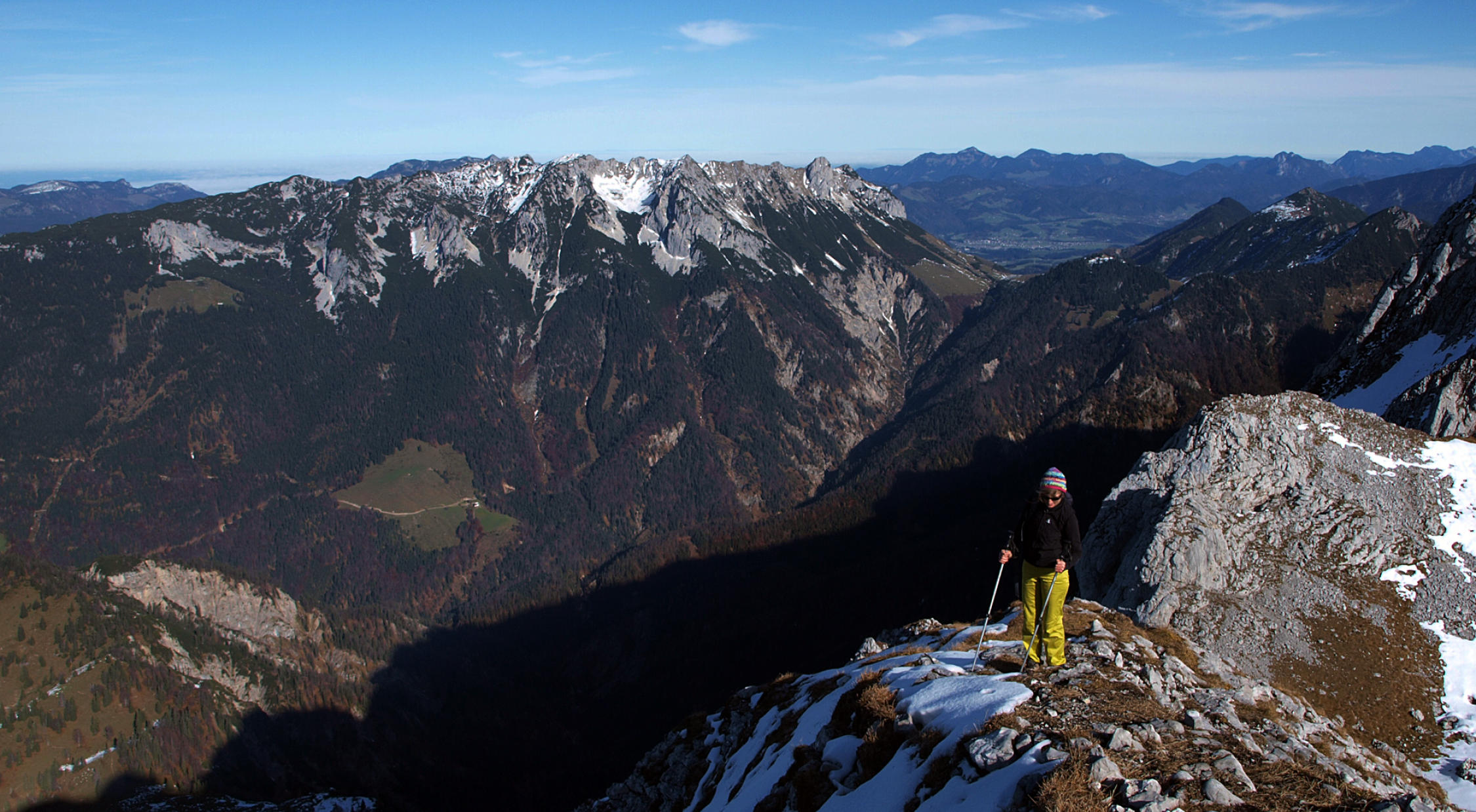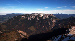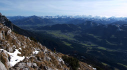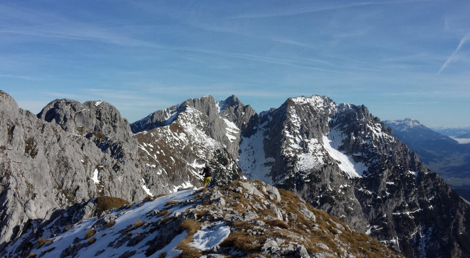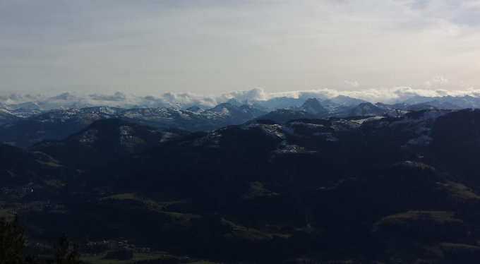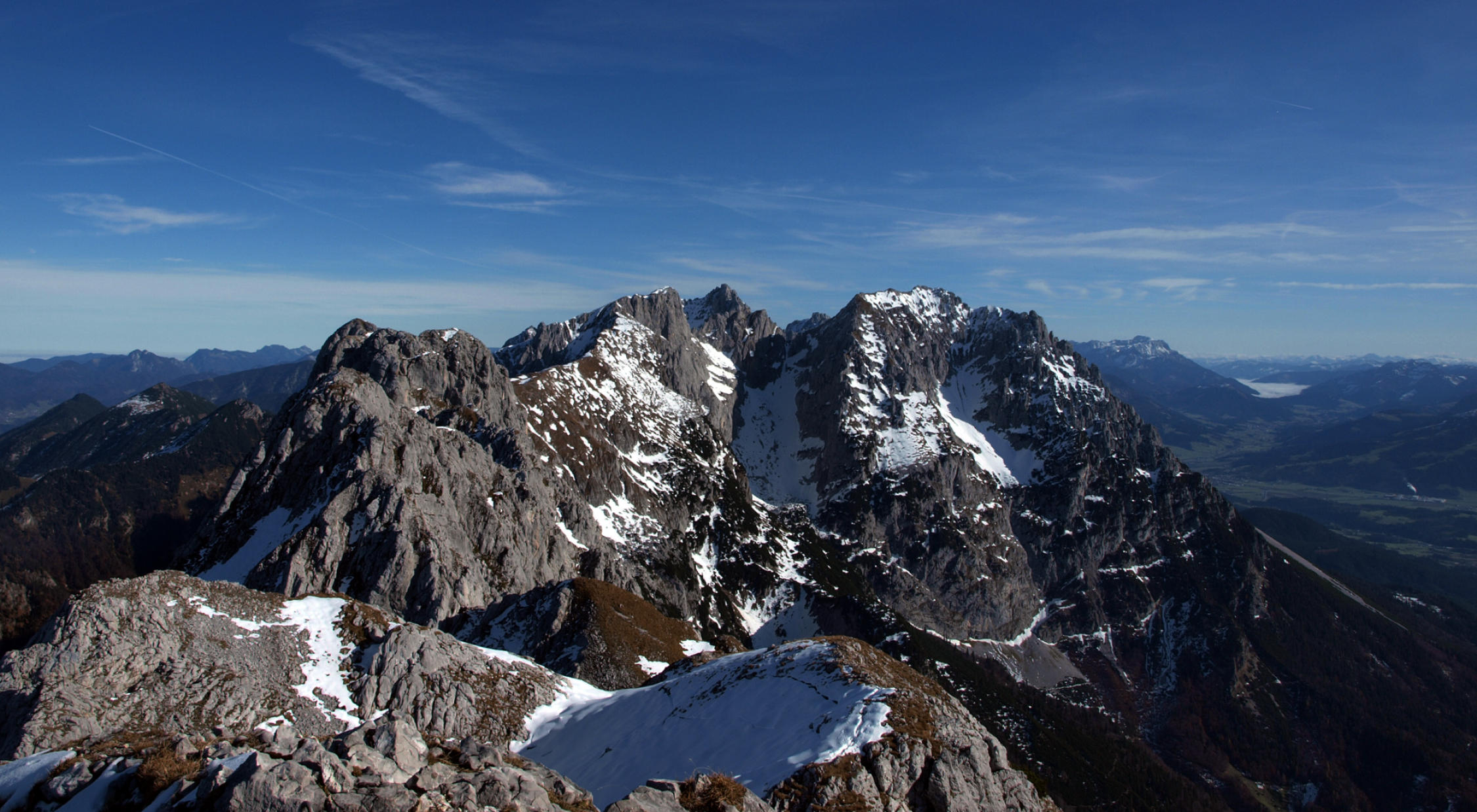 Vom Scheffauer hat man einen recht umfassenden Blick in die angrenzenen Berge. Südseitig ist der Schnee bis auf 2000m verschwunden, nordseitig bis mindestens 1400m! NAch Skitouren schauts also in den Kitzbühlern oder im Zahmen Kaiser derzeit nicht aus.
