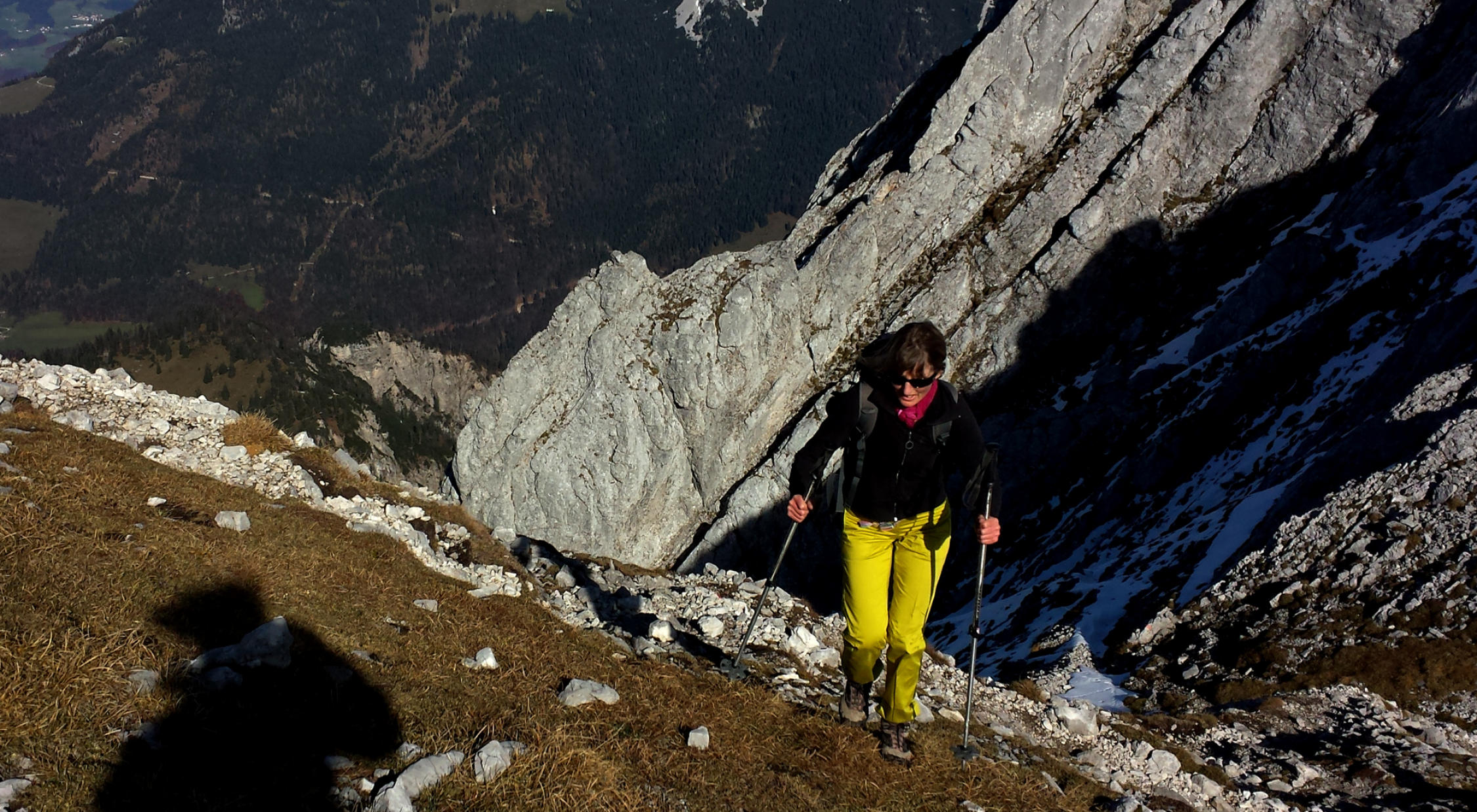 Während anderweitig Schnee und Regen in grösseren Mengen herunterkommen, kann hier mit dem T-Shirt aufgestiegen werden. Der Föhn hat die letzten Tage ganze Arbeit geleistet und dem Schnee im Kaiser sehr zugesetzt. So sind nur ein paar mehr oder weniger grosse Schneeflecken übergeblieben, welche nicht wirklich stören.