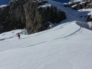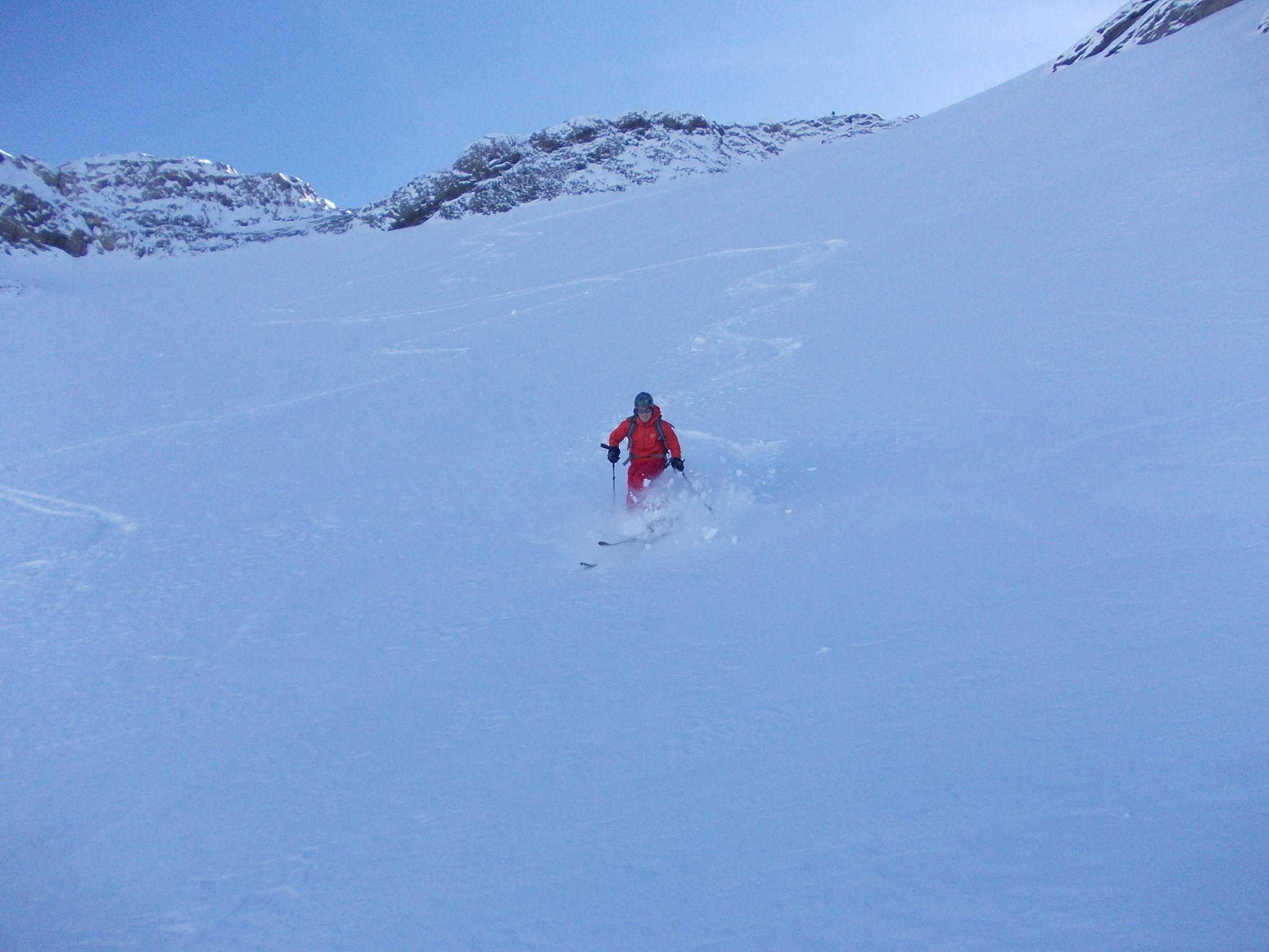 Bei unserer Variante 2 durchs Südcouloir vom Central Gipfel wunderbarer Pulverschnee. Das Culi erhält von den Felsen Schatten.
