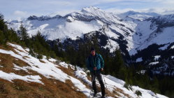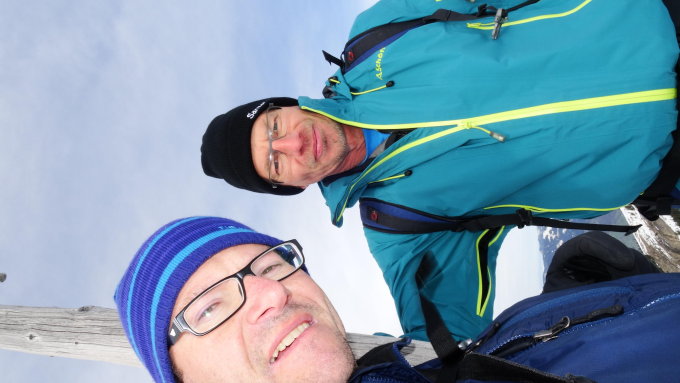 Der Grat ist weitgehend schneefrei. Am Gipfel Trittfirn. Wir haben die Schneeschuhe nur unterhalb der Hüttstett eingesetzt.