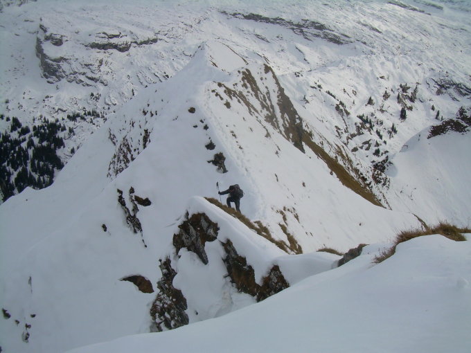Wir konnten schneefrei bis auf 1080 m oberhalb Aueli hinauffahren. Bis zur Fritschenhütte profitierten wir von einer Fußspur, danach war Spuren unsererseits angesagt. Spannend war dann der kurze Steilhang hinauf zum Punkt 2048, wo wir bis über die Knie im Schnee versanken und die Nasen schon fast auf dem Hang anstießen. Das unterste Drahtseil, ab dem Pickeldepot (siehe Fotos), konnten wir nochmals aus dem Schnee befreien. Der Steilhang und die anschließende Begehung des ausgesetzten Grates hin zum Gipfel verliehen diesem kleinen, aber feinen Gipfel einen alpine Note. Schneeschuhdepot unterhalb des Steilhangs. Mit Steigeisen war man aufgrund der Griffigkeit in diesen Passagen heute besser bedient, ich selbst hatte leider keine dabei.