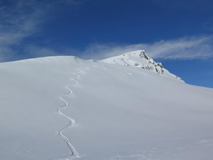Das ganze Gebiet ist sehr gut eingeschneit. Kräftiger Wind hat aber seine Spuren hinterlassen und Pulver ist nur noch in schattigen und windgeschützen Lagen zu finden.