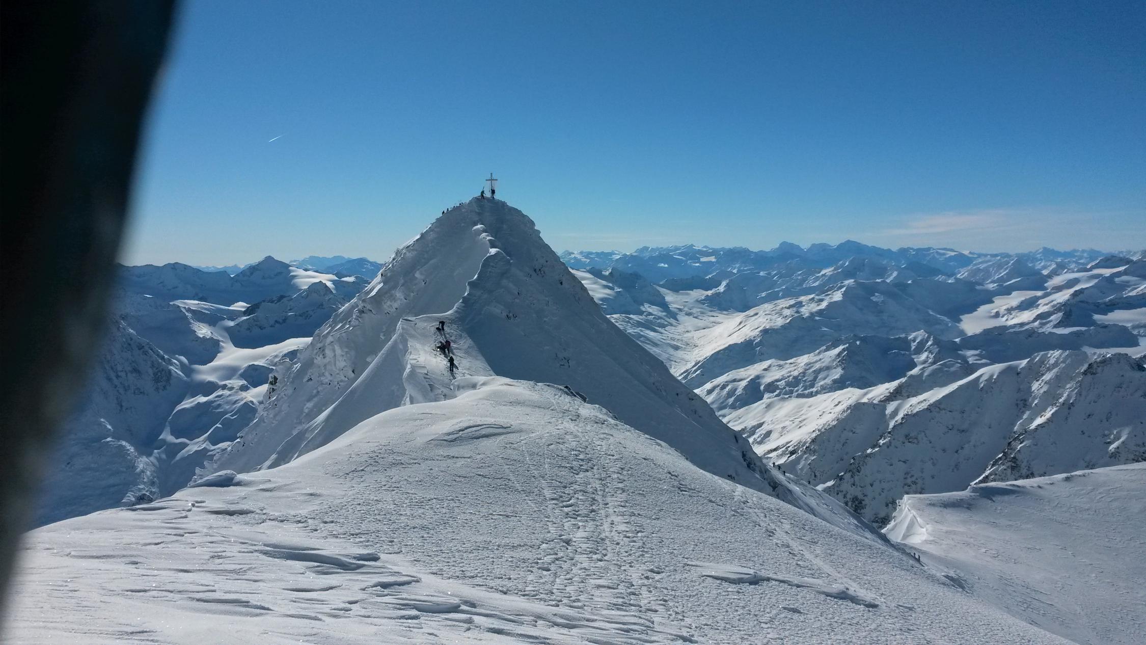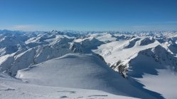 Wenig Schnee im Gebiet. Vom Skidepot zum Gipfel Trittschnee. Der Übergang zum Nordgipfel ist ohne Steigeisen etwas heikel.