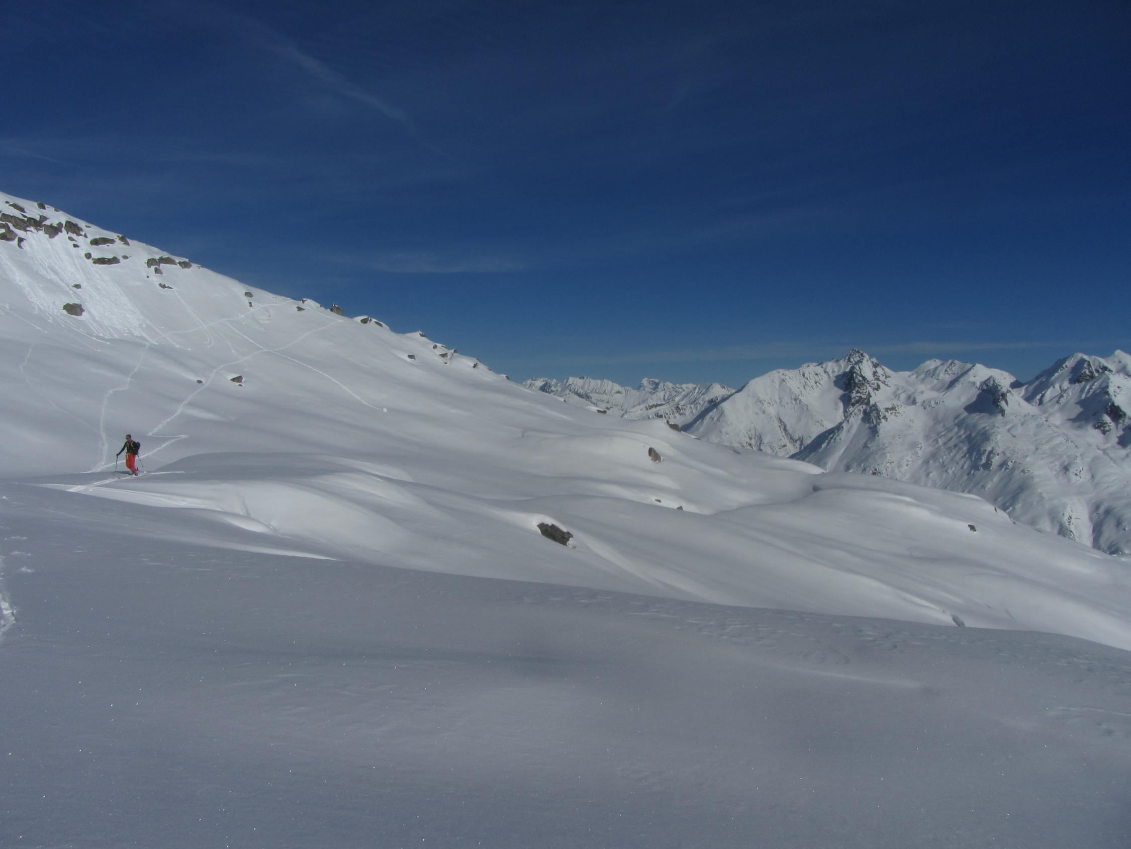 Gute Spur bis Winterhorn. Von da ab mussten wir selber die folgenden 10 km spuren (Phillip merci). Warm; südseitige Flanken weich, nordseitig Pulver. Fantastische Landschaft. Ab Lücke vor dem Lucendo wieder Spuren von Realp rauf und runter. Etwa 10 Abfahrstspuren direkt über den Gipfel ins Witenwaseneretal runter (sieht super aus) wir sind über die Lücke die Route für Warmduscher runter. Super Pulver. Es hat noch Platz.