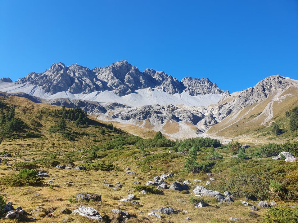 Ich steige direkt vom Gipfel sehr steil auf hartem erdigen Boden nach Norden und erreiche über viel Kies den kleinen Sattel. Von hier steige ich zum Einstieg in die Rinne hinab. Komisch, dass diese Stelle nun zu steil für einen Abstieg ist? Damals war das nicht so. Ach ja, damals hatte die Rinne ja auch noch Schnee drinnen. Nun ist das Gelände deutlich steiler geworden. Im Schnee konnte ich mir damals gute Tritte einhauen, sogar ohne Steigeisen, was mit diesem harten Boden heute unmöglich ist. Es hat nebenan keine festen Steine oder Felsen, um diese Stelle hinab zu klettern. Der Boden ist sandig und betonhart. Ich kann diese Stelle nicht guten Gewissens in so steilem Gefälle passieren. Ich überlege hier nochmals zurück zum Gipfel zu kehren und als Abstieg die Aufstiegsroute zu wählen. Widerwillig packe ich doch noch meine Not-Reep-Schnur aus, finde nur einen einzigen Stein, der mir nicht wegrutscht, binde es dort herum, vergrabe es mit Steinen und steige so mal die ersten 5 Meter in die Rinne hinab, finde da zum Glück noch einen weiteren runderen, der im harten Boden schon einbetoniert ist, riskiere es mit der Eingrabe-Notall-Technik und steige so nochmals 5 Meter hinab. Naja, dies ist das Gegenteil von schnell und effizient. Doch nun ist die Wahl, wieder zurück zum Gipfel zu kehren, gänzlich gestrichen, denn hier hoch würde ich wohl nicht mehr einfach so kommen. Als würde das nicht genügen, kommt plötzlich Steinschlag von S nach N in diese enge Rinne herab. Zuerst nur Geröll, später auch mal etwas Grösseres hinterher. Nur 2 Meter neben mir donnert ein Gesässbreiter Steinbrocken hinab. Also keine Menschen, keine Tiere, das kann nur noch der Wind oder das Permafrost sein... Ich flüchte reflexartig in der Rinne am nördlichen Rand und kann hier wie im Kino zusehen, wie die Rinne als Rutschbahn dient. Nach einer gefühlten langen Minute wird es wieder ruhig und mir bleibt wohl oder übel nichts anderes übrig, als hier weiter hinab zu steigen, am liebsten im Turbo-Modus, was aber das Gelände leider nicht her gab. Ich steige weiter hinab zu einem grossen Stein, der die Rinne blockiert. Klettere diesen, dank der Seitenwand, gut hinab zur III-er Stelle in der zweiten Rinne, die sich in der oberen, resp. die zweite Rinne, sich mittig befindet. Diese Stelle mit den plattigen Felsen mit Sand bestückt ist, wie letztes Jahr auch schon, ein Graus. Ich finde da nicht gleich guten Halt, möchte mich hier wegen dem Steinschlag nicht lange aufhalten, packe rasch wieder die Reep-Schnur aus, finde nichts Stabiles um das Seil zu fixieren, vertraue einem winzigen Daumenstein mein Gewicht an, und komme so diese Stelle so rasch hinab. Nun endlich weniger Steil hinab über Schutt und Geröll zum Ende der zweiten, resp. zum Anfang der ersten oberen Rinne. Zuoberst fliesst in der Rinne etwas Wasser hinab. Es scheint hier eine Art Quelle im Felsen zu geben. Das Gestein wird deswegen sehr rutschig. Aus dem Turbo-Modus wird es wieder ein Langsam-Modus, was die Nerven etwas strapaziert. Da komme ich an einer zweiten Stelle an, die hinabgeklettert werden muss (III-). Diese hatte ich schon ganz vergessen gehabt… Danach steige ich etwas östlich ausholend in eine andere Rinne, die weiter unten wieder in die ersten Rinne mündet. Ab der Mitte hat es östlich am Rande doch noch Schnee unter dem Schutt (oben hätte ich den Schnee lieber gehabt), Erinnerungen am Piz dals Vadès, wo ich auf meinem Allerwertesten deswegen ausgerutscht bin, kommen hoch. Die Schürfung am rechten Knie, gleich neben der des Piz dal Cuatal von vorgestern, genügen mir für heute. Ich versuche auf feste Felsen weiter hinab zu steigen und komme unten endlich aus dieser Rinne wieder heraus. Zuoberst in feinstem Kies, später im Schutt und unten im Geröll rutsche ich beim Gravas Alba vergnügt hinab zu P2495 und steige mit müden Beinen zum Bach beim God da la Sprella (P2097), wechsle meine Schuhe, humple zurück zum Velo und flitze dank dem E-Motor genüsslich via S-charl zurück nach Tschierv.