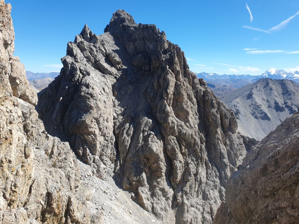 2. Der E-Grat scheint hier im Zweifelsfall die elegantere Lösung zu sein. Sie kann praktisch bis im späten Herbst, resp. bis zum ersten Schnee, problemlos begangen werden, was mehr Sicherheit gibt, wenn man die Schneeverhältnisse vor Ort nicht gerade kennt. Doch auch wenn man sie kennt, hat man leider aus dem Val Tavrü keine Einsicht zur zweiten oberen Rinne! Doch beim E-Grat ist dafür die Weg Findung viel kniffliger, v.a. der Einstieg. Möchte man gänzlich auf dem Grat bleiben, wird die Tour sehr anspruchsvoll und meiner Meinung überschreitet sie die III-er Kletterschwierigkeit und geht schon in Richtung S-. Umgeht man die Stellen leicht südlich in den Geröllrinnen, ist die Tour einfacher, man läuft aber Gefahr über die Nationalparkgrenze zu gelangen, was strengstens verboten ist. Doch auch mit den leichten südlichen Umgehungen, v.a. beim ersten Gratkopf, sind mind. zwei kurze III Stellen zu bewältigen. Zudem hat es ein paar stark abschüssige Passagen, die konzentriert begangen werden müssen.