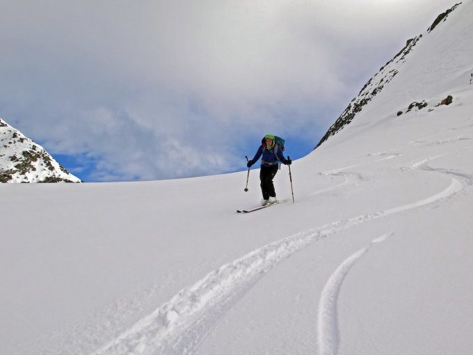 Ab ca. 2500 gut gesetzter Pulverschnee, darunter durchfeuchtete Schneedecke. Unterhalb 1800 Hm. wirds dürftig mit der Schneemenge.