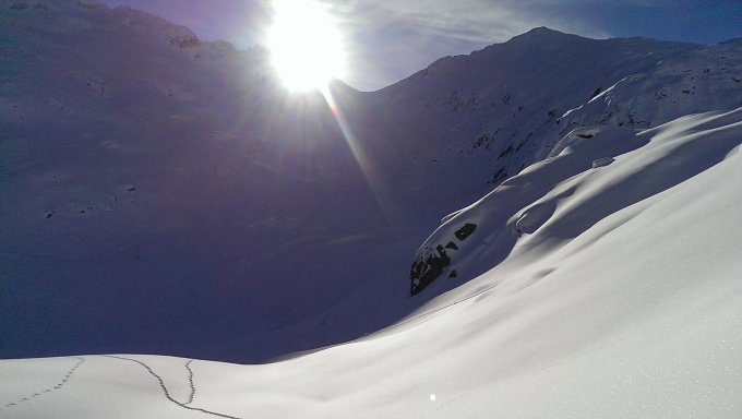 Wir sind dann noch den schönen Hang Richtung Rottondohütte abgefahren und anschliessend noch auf das Rottällihorn aufgestiegen. Die nordseitige Abfahrt bis ins Muttentobel hatten wir besten Powder, die abschliessende Abfahrt dem Bach entlang war ein kleines Abenteuer für sich;-)