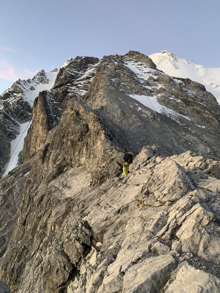 Gletscher mit guter Spur, Spalten gut gedeckt. Es hat dennoch einige und durchaus grosse, aktuell mit der guten Hartschneeauflage aber problemlos. Kein Blankeis, Steilstufe hoch zum Plateau mit guten Tritten direkt neben den Felsen. Ausgeapert sicher deutlich anspruchsvoller, für den Abstieg hat es einen Abseilring (50 m Seil wohl knapp ausreichend). Ab 3700 m sehr zügiger Wind und wirklich unangenehm kalt, bis dahin eher angenehm warm.