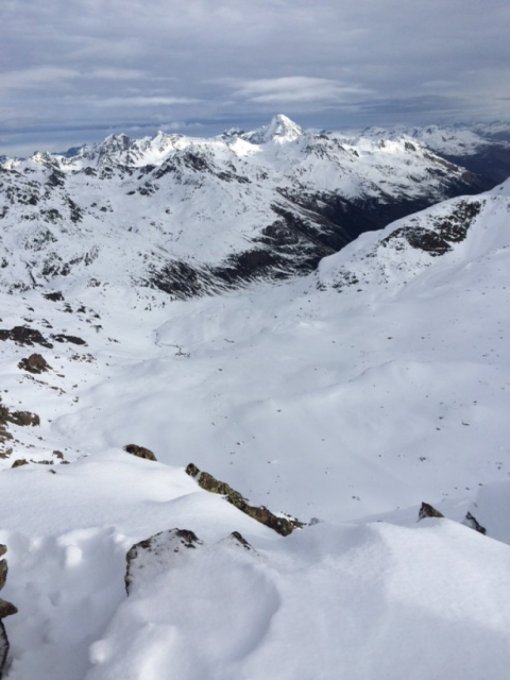 Ab Pp viel Schnee für die Jahreszeit. Der Schnee ist morgens sehrgut tragend, auch bei der Abfahrt. Dadurch geringe Gefahr durch eingeschneite Steine. In der Nacht auf Sonntag kamen wenige Zentimeter Pulver darauf, was will man mehr. Die direkte Nordflanke wurde auch befahren. Abfahrt bis 2450m in schönem Lockerschnee und Pulver. Weiter unten wurde es durch gefrorene Altspuren ruppig. Ab 11 Uhr sehr warm.
