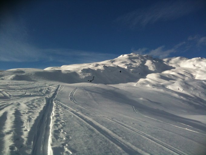 Abfahrt in etwa entlang der Aufstiegsroute. Bis circa 2300 m durch die dünne Neuschneeschicht sehr schön zum fahren und drehen, obschon wirklich alles zerfahren ist. Der Rest bis runter ist ein zäher, mühsamer, harter und zerfahrener Mist. Mit ein wenig Umsicht kann man bis runter zur Brücke ohne Abschnallen kratzen. Aber Fahrfreude ist gleich Null.