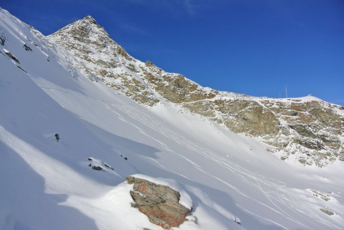 Hervorragend. Schnee der Kategorie "Pulver Champagne" auf gut gefestigter Unterlage über die gesamte Tour. Ab und zu Steine, die vom neuesten Pulverschnee überdeckt wurden; eigentlich sind diese erkennbar, da auf Rippen oder Fels durchsetzte Passagen, aber Überraschungen kann es geben…