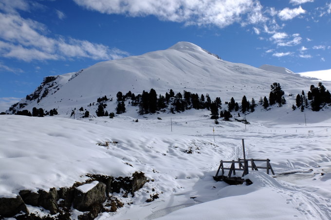 Ab der Postautostation Buffalora sollte man die Skier noch 5 minuten tragen (1 Bach, 1 Baum), dann kanns losgehn. Ab der Alp Buffalora nimmt der Schnee dann deutlich zu. Durch schönen, lichten Arvenwald kommt man zur Ebene von Jufplaun, dann kann die Steighilfe umgeklappt werden. Auf dem ganzen Hang zum Piz Daint liegen etwa 10 cm Pulverschnee auf einer alten Hartschneedecke, traumhaft zu fahren, bis jetzt zieren erst 4 Abfahrtsspuren den Berg.