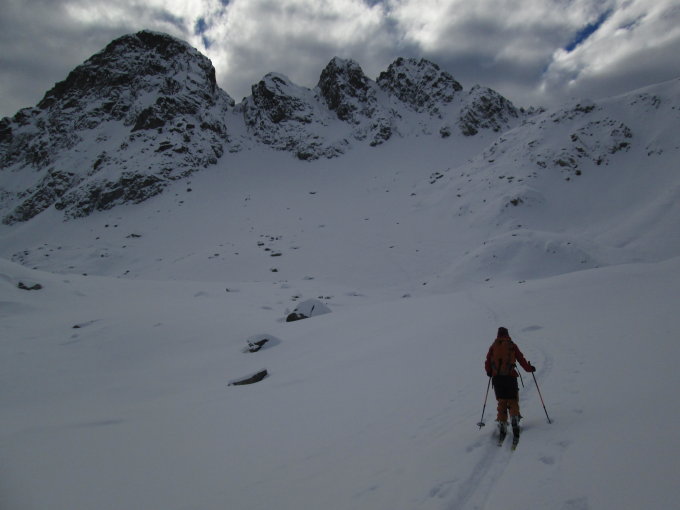 20cm Pulver auf harter Unterlage. Die vielen alten Spuren sind zwar schon recht gut eingeschneit aber bei der Abfahrt merkt man sie noch gut. Schneller Wolkenaufzug am Morgen. Darum Blind(und)Flug bei der Abfahrt. Schade bei diesem herrlichen Schnee!