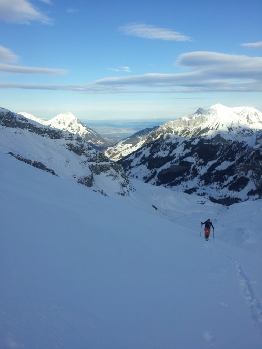 Strasse ab Tschingel bis Bundläger problemlos mit Tourenski begehbar (wir sind ab Griesalp gestartet). Anschliessend muss man sich einen Weg zwischen den Steinen zum Schnattweng-Rücken suchen und kann dort auf auf der mit ca. 20cm Pulver überzuckerten und tragenden Altschneedecke aufsteigen. Ab ca. 2500m bis Hohtürli immer häufig werdender Steinkontakt. Wegen der Neuschneedecke sind die "aperen" Stellen kaum auszumachen, man erkennt sie meist erst unmittelbar beim Spuren.
