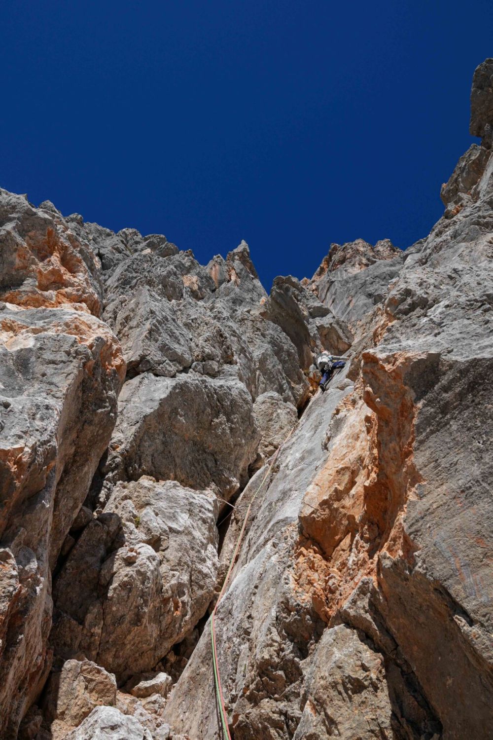 Ein wahrscheinlich im Herbst 2023 erfolgter Felssturz im oberen Teil hat in der vierten SL und zu Beginn der 5. SL Gries, Schotter und lose Blöcke hinterlassen. Die Kletterei dort ist heikel. Über dem Stand nach der 4. SL versperren tonnenschwere, wahrscheinlich labile Blöcke die Gipfelschlucht. Unterhalb kann heikel nach links gequert und der Steilaufschwung der 5. SL erreicht werden.