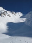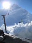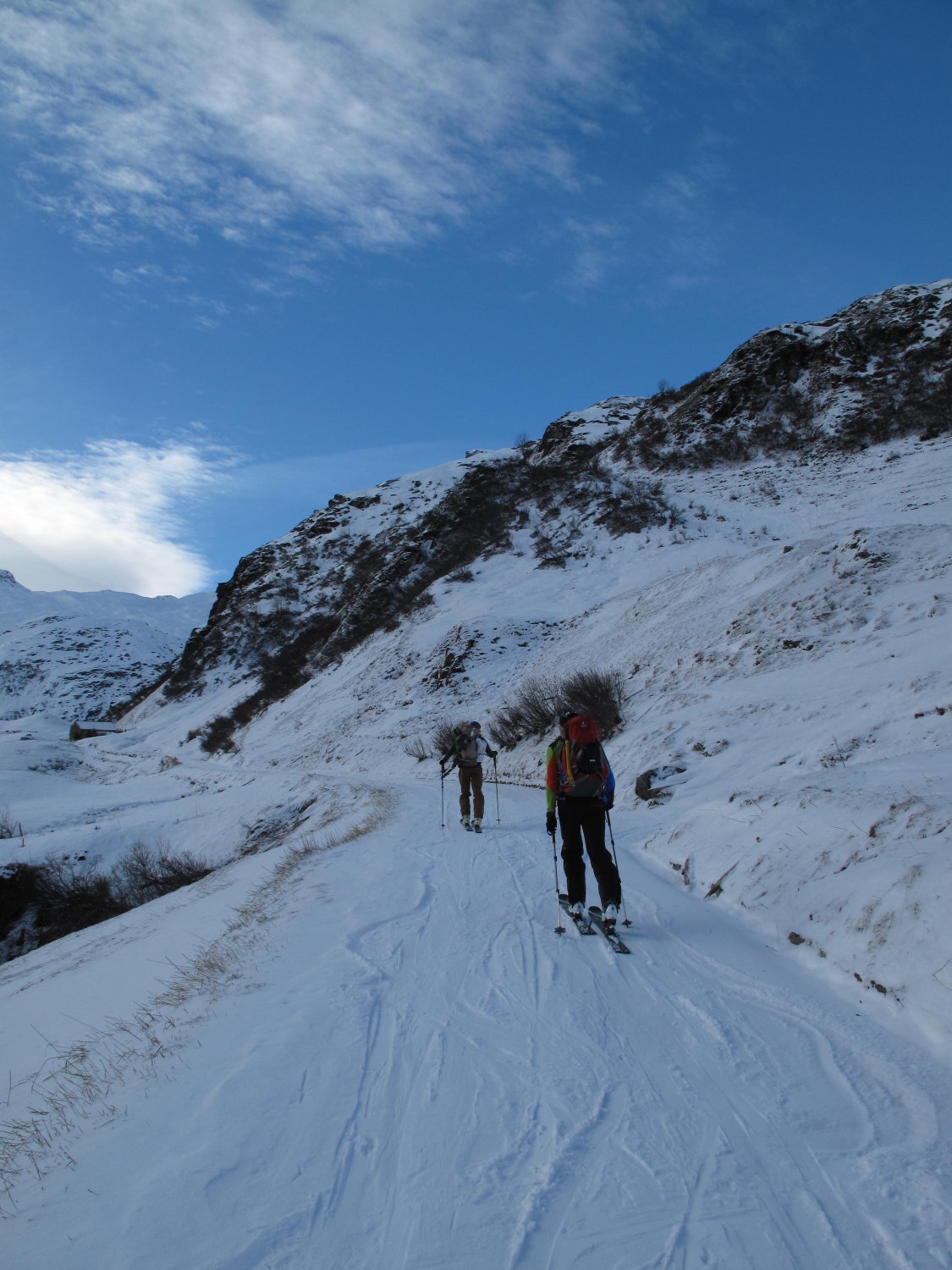 Strasse nur teilweise mit wenig Schnee bedeckt, bis auf knapp 2000m einige Tragepassagen vorhanden. Duch den Föhn dürfte sich diese Situation eher verschlechtert haben. Die Schneedecke oberhalb 2000m is größtenteils abgeblasen und steinhart. Bis etwa 2500m abgeblasene Kruste, darüber stellenweise lockerer windgeprägter Altschnee.Stellenweise heikle Triebschneesammlungen die leicht auslösbar sind. Durch den starken Föhn sind wir am Nordgratjoch umgedreht.
