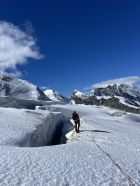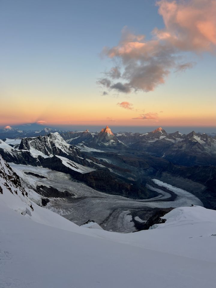 Start um 3:30 ab der Hütte bei erstaunlich warmen Temperaturen. Kurze Spaltenzone auf aperem Gletscher unschwierig passiert, danach der klaren Spur bis auf den Sattel gefolgt. Wunderbarer Sonnenaufgang mit dem erreichen vom Sattel um 7:12.