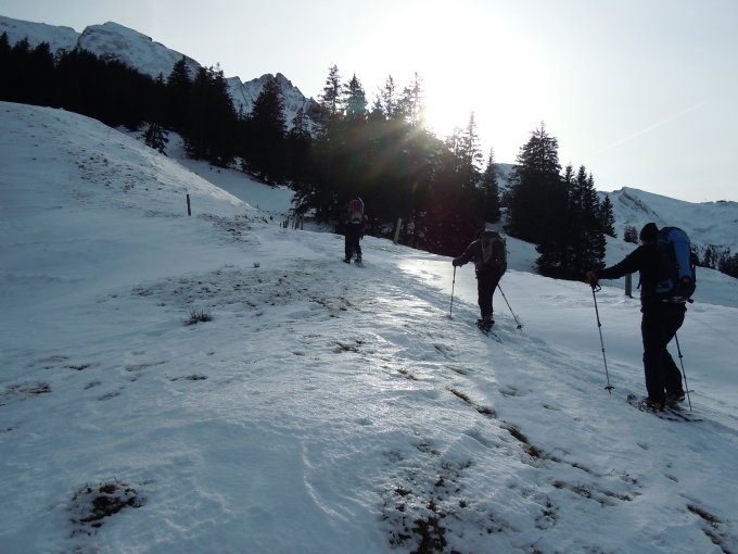 Unterhalb Brisenhaus dem Sommerweg entlang auch ohne Schneeschuhe machbar. Bequemer jedoch mit diesen "Brettern", da die Mulden und Löcher gleichwohl mit Schnee gefüllt sind. Wir benutzten die Schneeschuhe ab Ahorn, 1314 m.