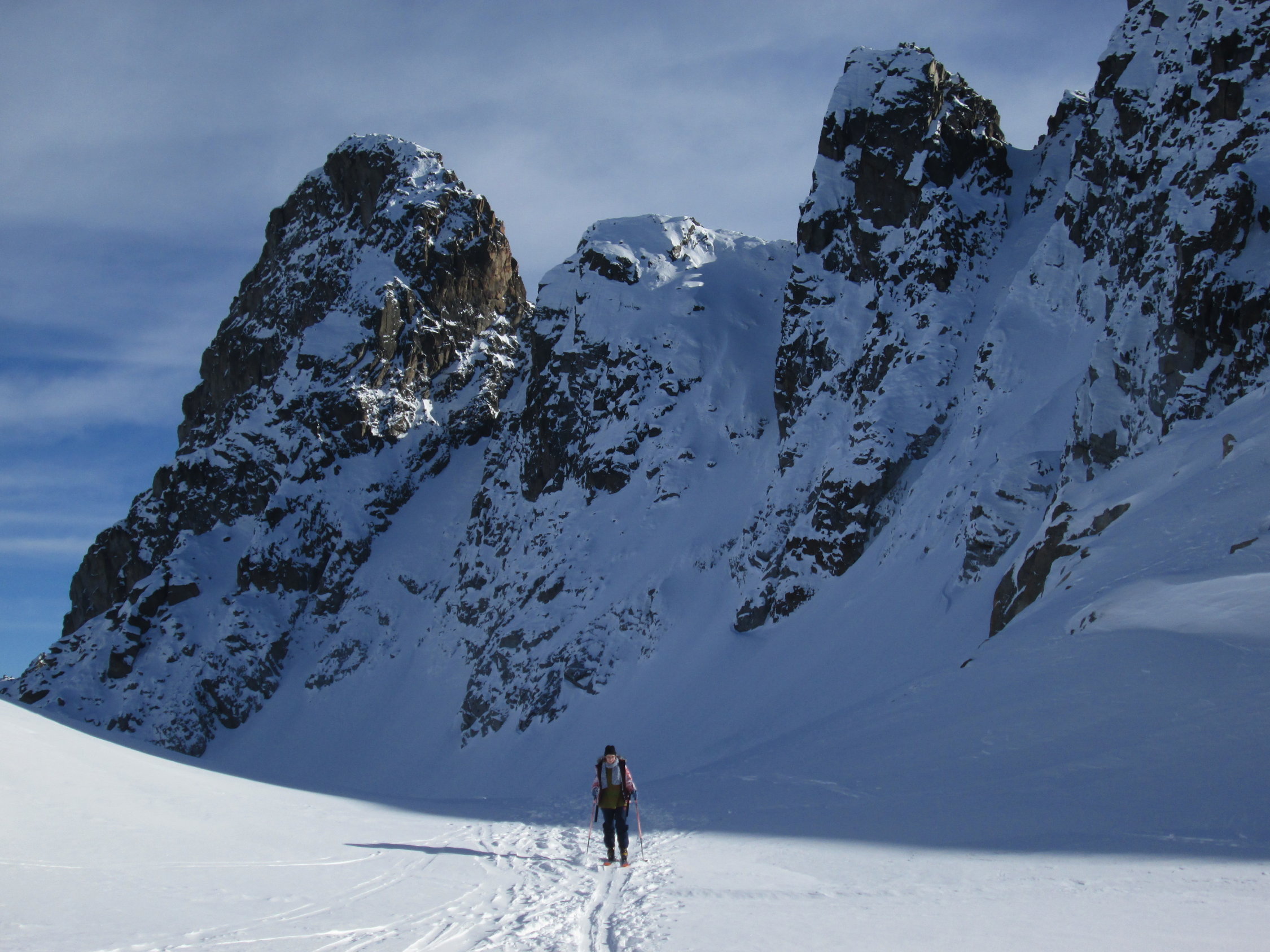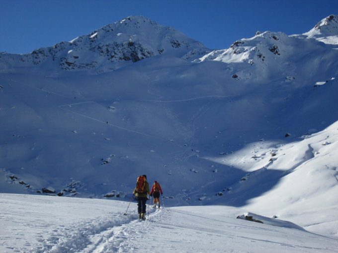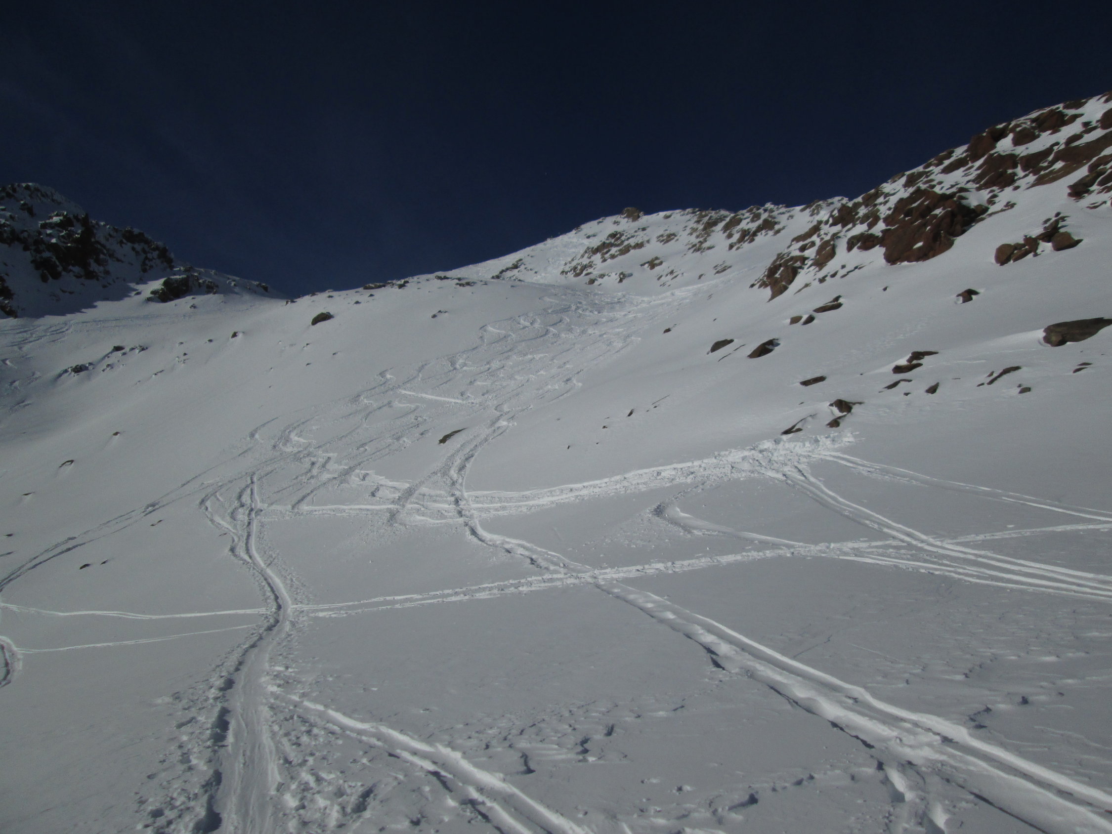 Schnee immernoch meist pulvrig, sonst windgepresst. Viele Leute am Flüelapass unterwegs. Kein Wunder an so einem herrlichen Tag.