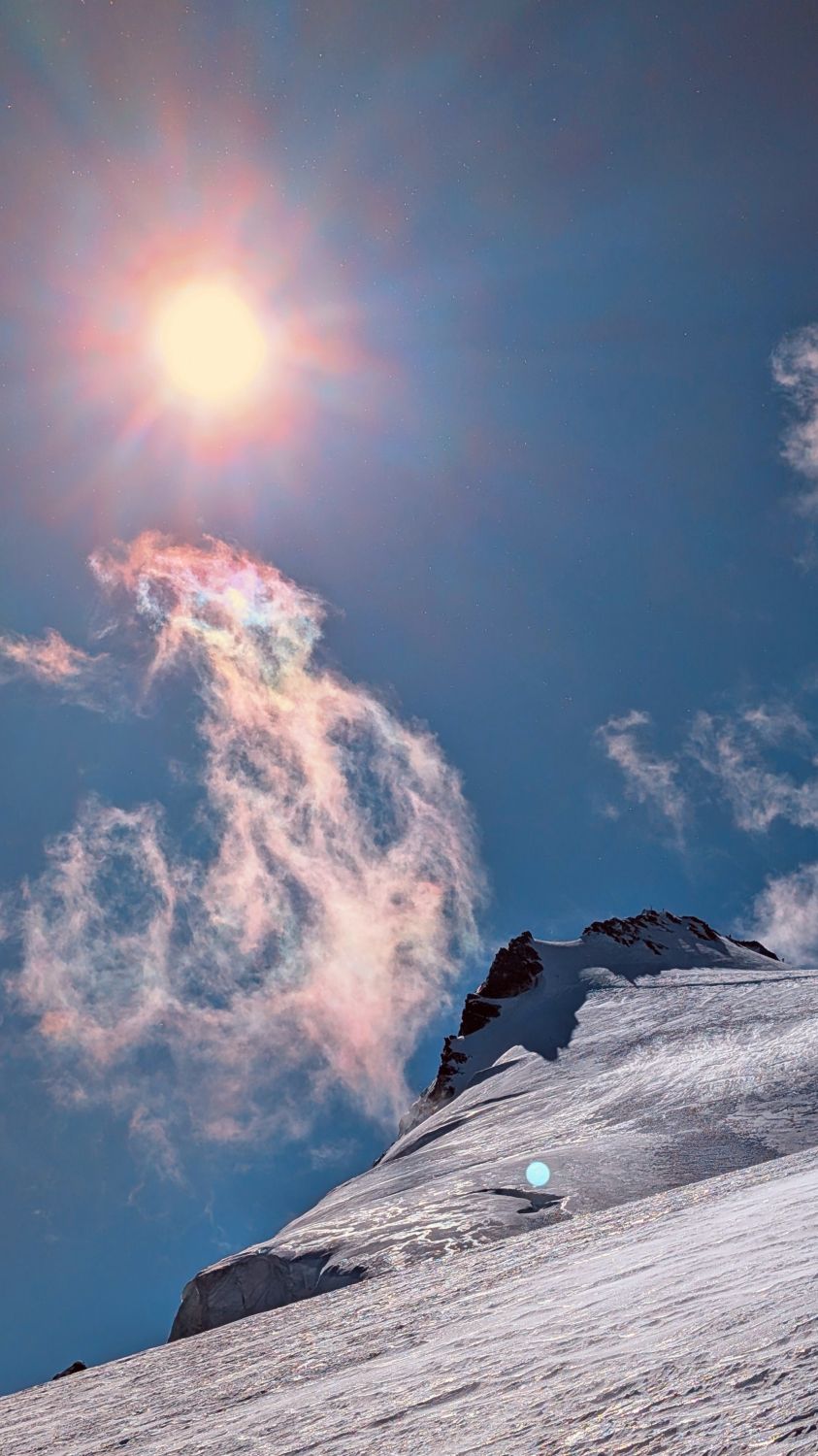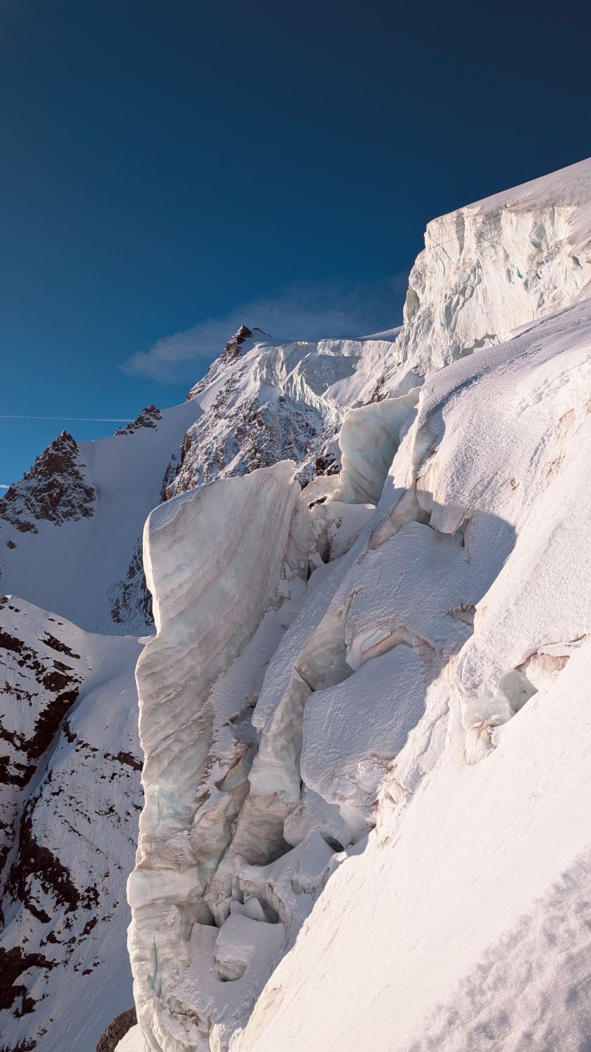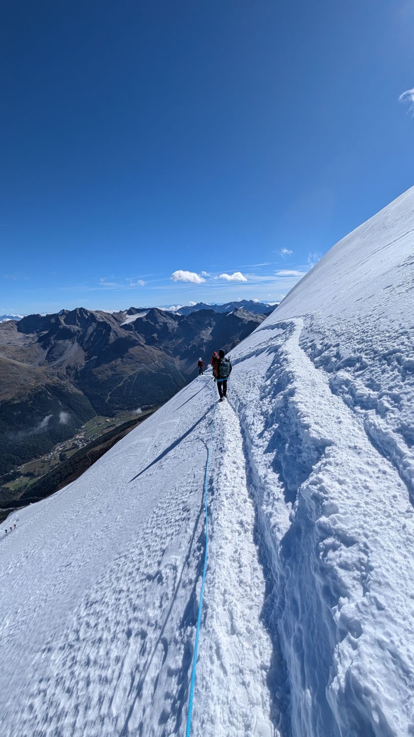 Gletscher ist vom Anseilpunkt bis zum Gipfel schneebedeckt, keine Blankeisstellen. Keine Eisschrauben etc. nötig. Steilaufschwung zum Ortlerplatt ist gut machbar. Sehr sehr wenige sichtbare Spalten auf dem Normalweg. Kalter Wind auf dem Ortlerplatt bis zum Gipfel.