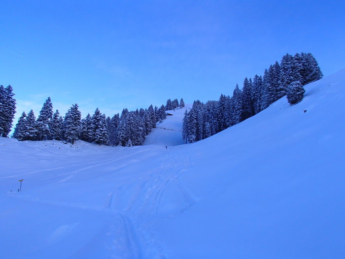 Viel Neuschnee, der gut zu fahren ist. Mit einer geschickten Streckenwahl kann man den Boden- bzw. Steinkontakt im mittleren Teil vermeiden.