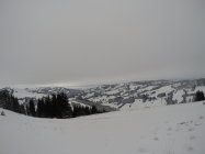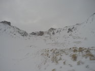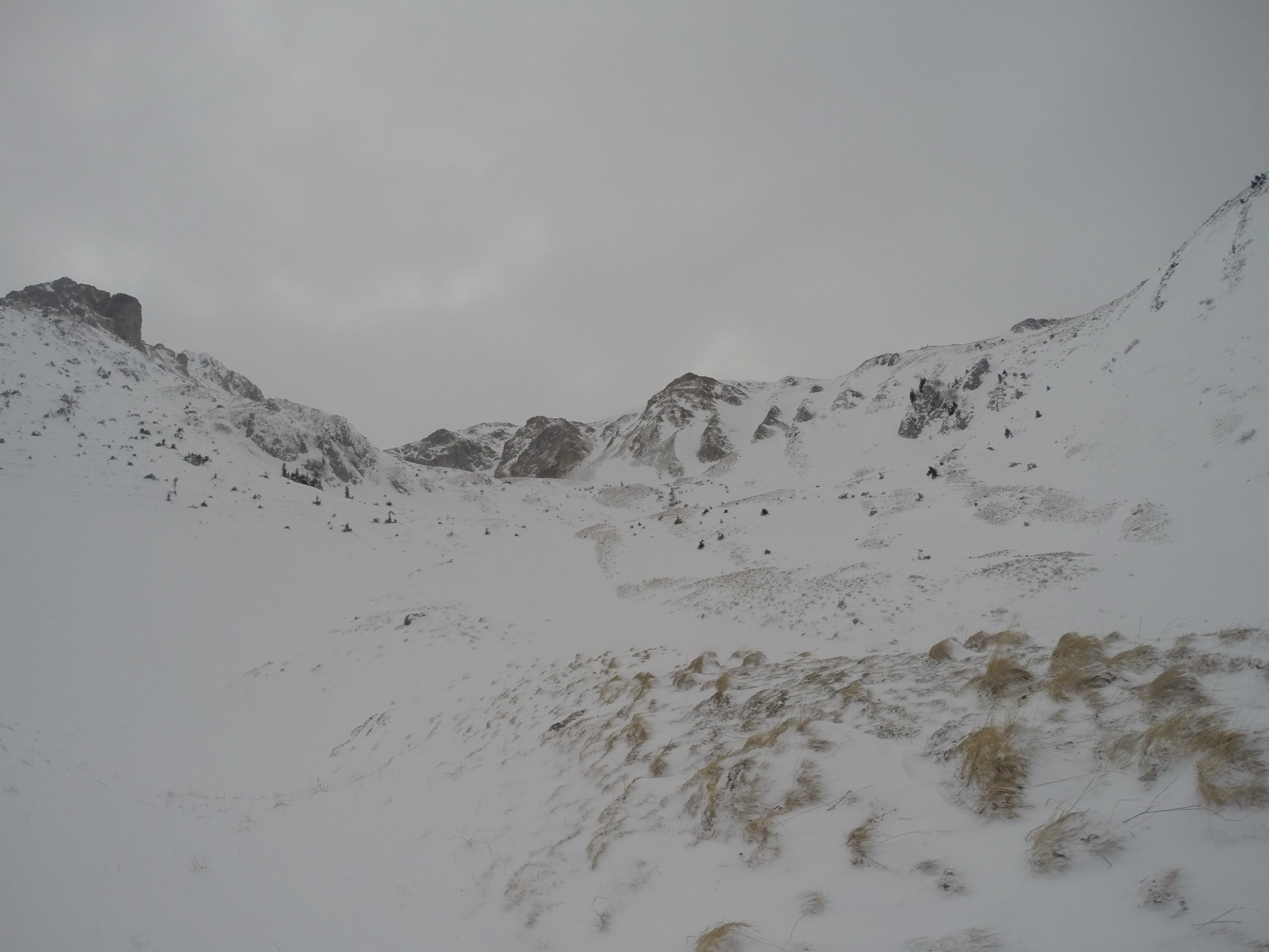 Der Schnee in den Mulden und Hängen ist windgepresst.