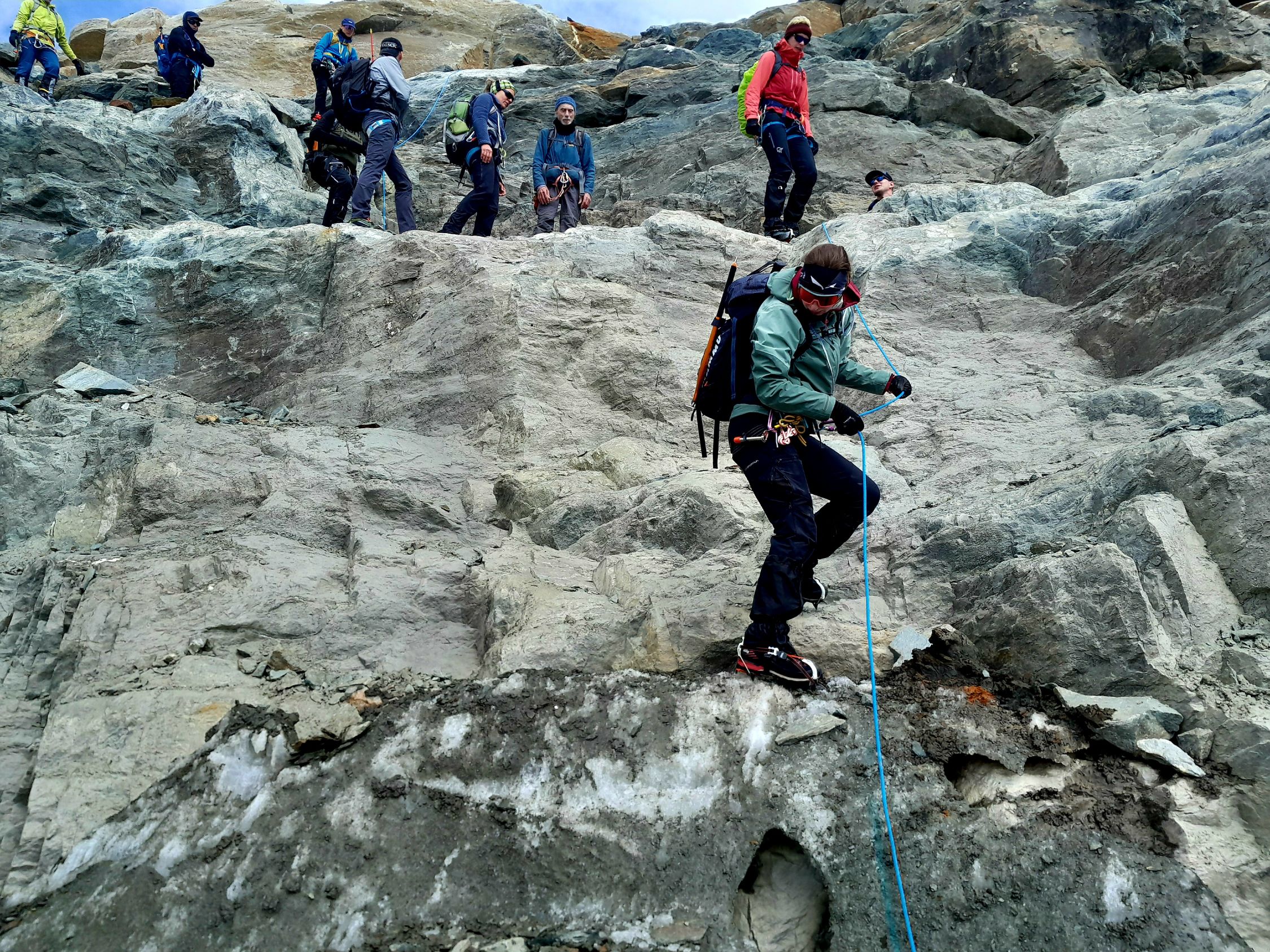 Vor einem Jahr war es auch im Spätsommer ab 3200 m eine reine Gletschertour. Dank starker Gletscherschmelze liegt nun auf 3500 m ü.M. eine 20 m hohe Felsbank frei. Keine schwierige Kletterei zwar, der Bergschrund aber erfordert etwas Vorsicht.