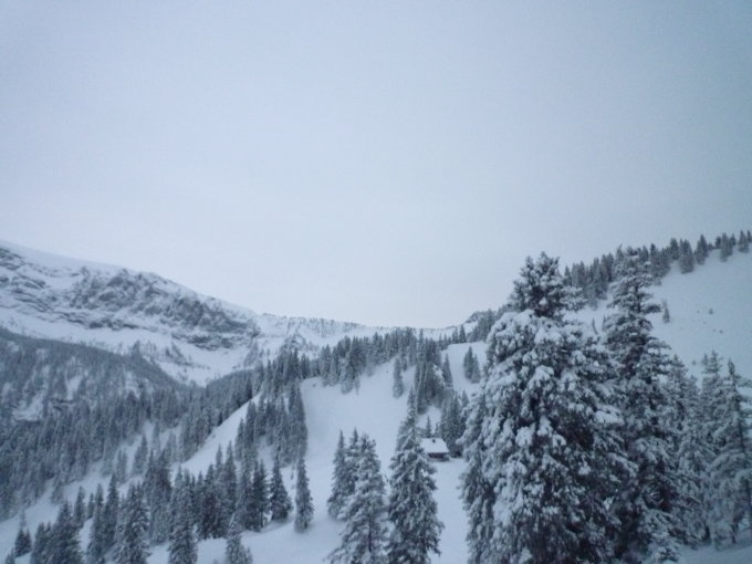 Seit gestern mind. 20cm Lockerschnee hinzugekommen. Die Spuren des Vortages waren im oberen Bereich kaum mehr zu erkennen. Gipfelhang ist nun auch gespurt, es liegt sehr viel Powder drin, mind. 60cm. Oben am Grat nur ca. 30cm.