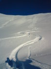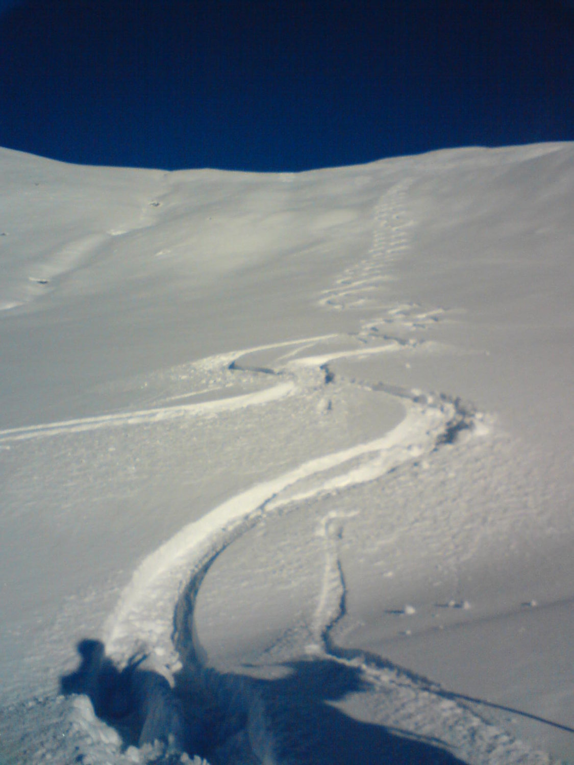 Gute Verhältnisse. 45 cm Pulver. Wir waren absolut allein. Jetzt hats eine Spur. Im Bereich des Grates grosse Vorsicht nötig, um Steinkontakte möglichst zu vermeiden (das ist da oben aber glaublich immer so).