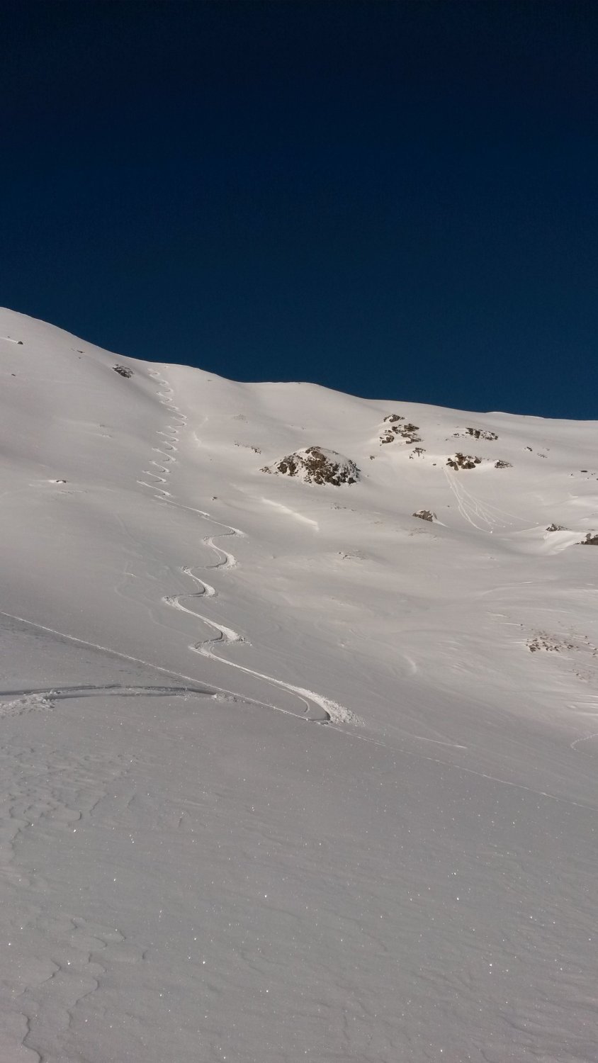 Der Gipfelhang war um die Mittagszeit schon leicht am Ansulzen, aber unten raus war es perfekter Pulver.