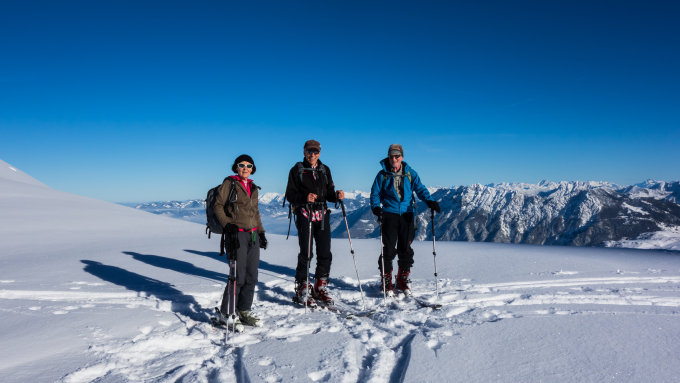 Traumwetter, windstill, mild. Die ganze Gegend ist wunderschön eingeschneit und auf der gesamten Abfahrt perfekter Pulver ohne Steinkontakt. Es waren relativ wenig Leute unterwegs, angesichts der perfekten Tourenverhältnisse.