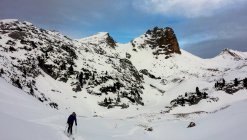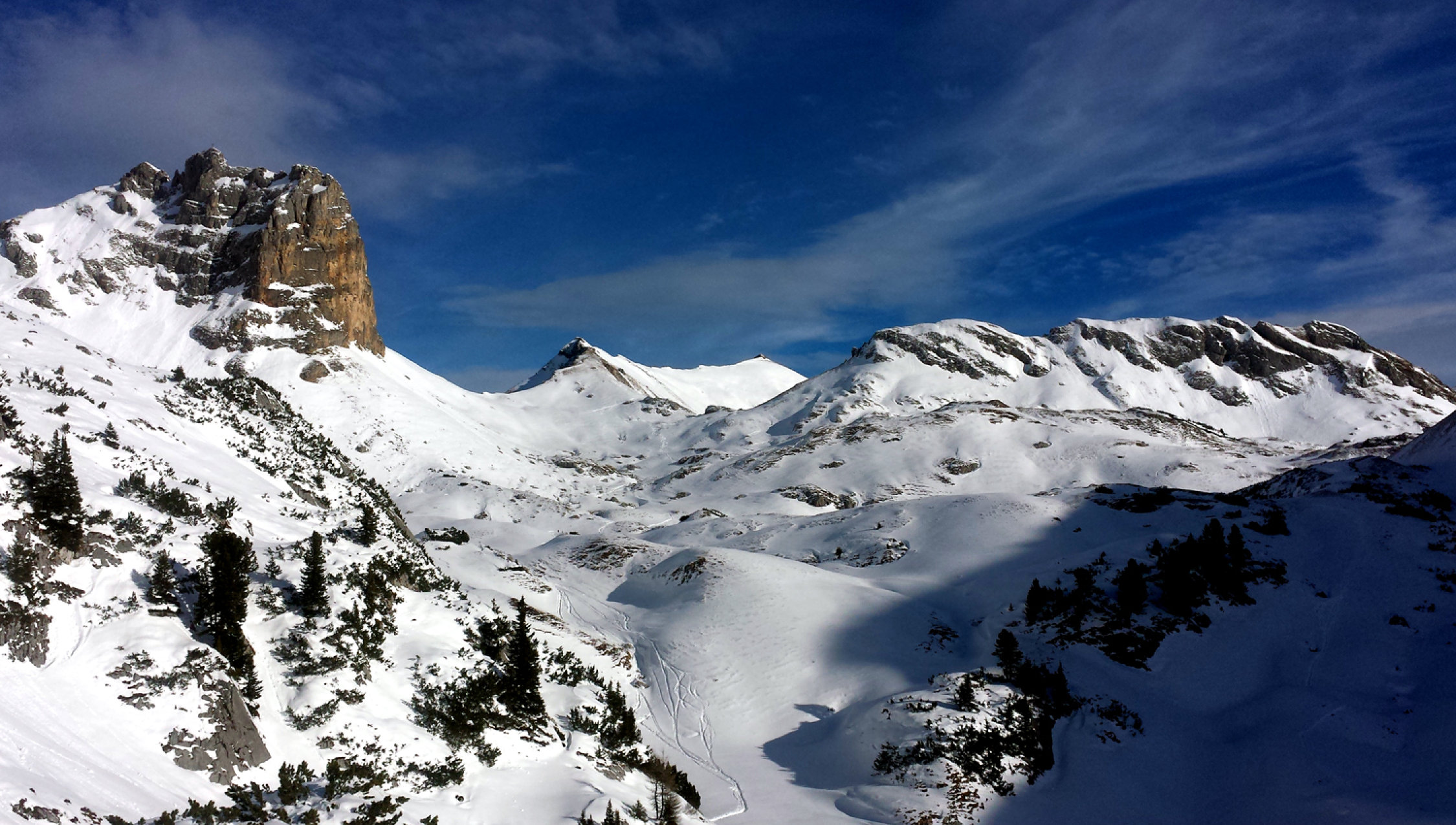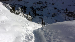 Entgegen der veröffentlichten Werte ist die Schneemenge weit weniger wie man aufgrund der Werte (68cm, gegenüber 85cm in den Chiemgauer Alpen) annehmen könnte. Die Latschen sind kaum eingeschneit, ebenso wie die zahlreichen Steine. Dazwischen ist der Schnee grundlos und nicht verfestigt. Andrerseits sind manche Mulden und Hänge tückisch eingeweht und lassen reichlich Instabilität vermuten. Dies haben wohl auch andere so empfunden, die Rofanspitze wurde wohl von mehreren Partien angespurt, jedoch nicht bestiegen (bis 13:00).