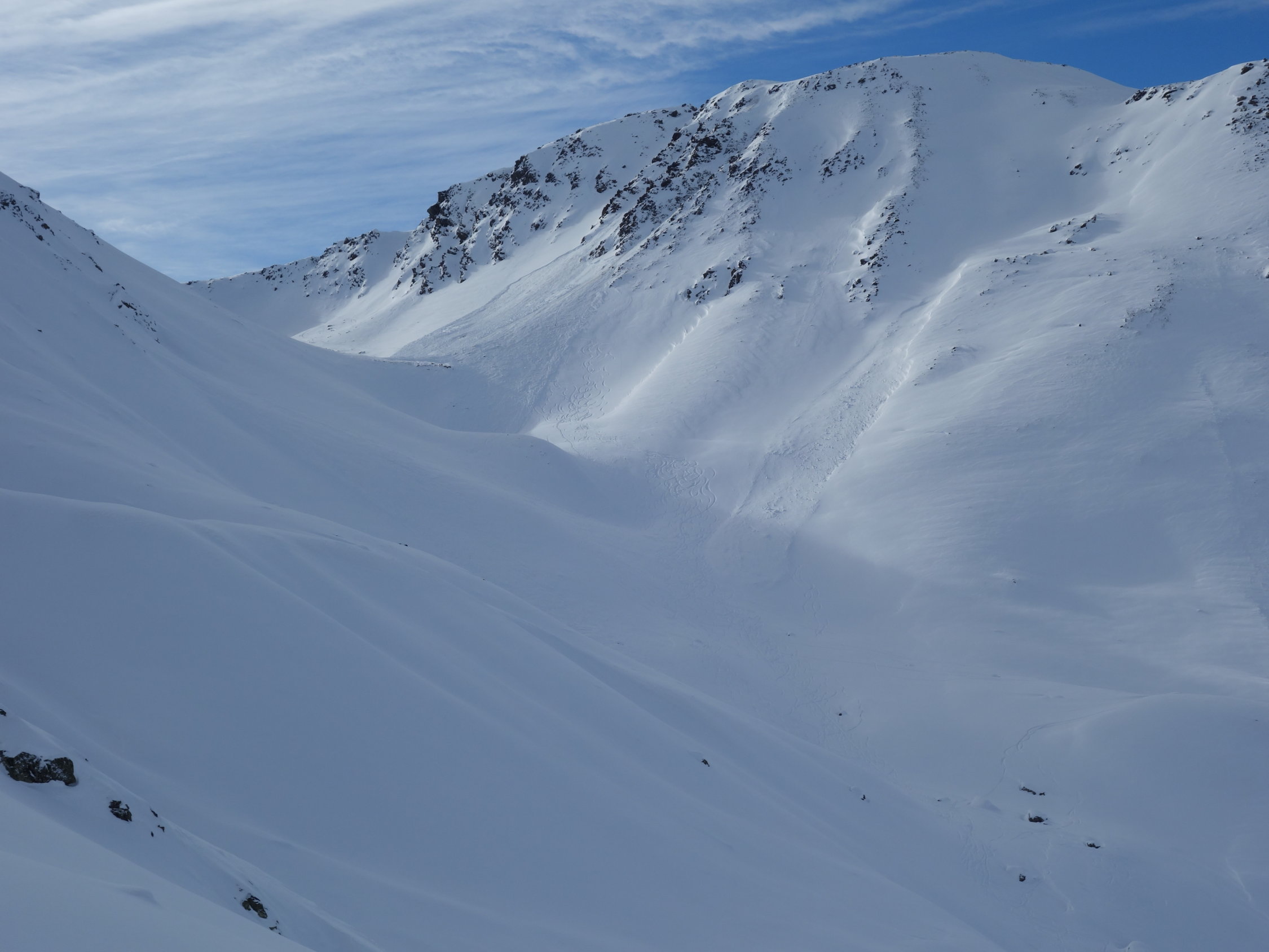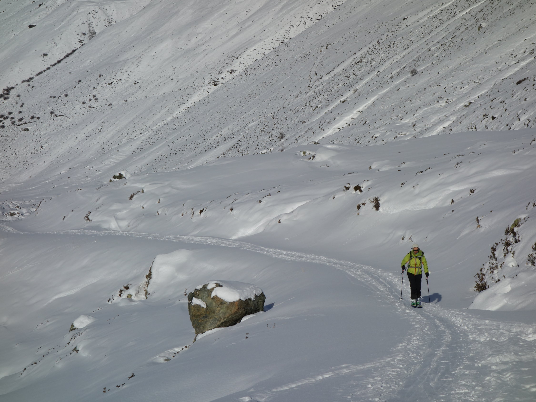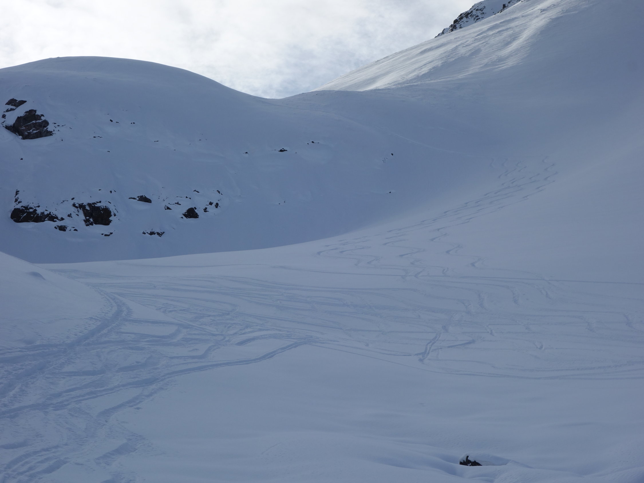 Sehr gute Verhältnisse: im Chüealptal feste Schneedecke ohne Steine. Wir sind im Gletschertälli bis Höhe 2700m gegangen und dann umgekehrt. In der Abfahrt lockerer Pulver 20-30cm.