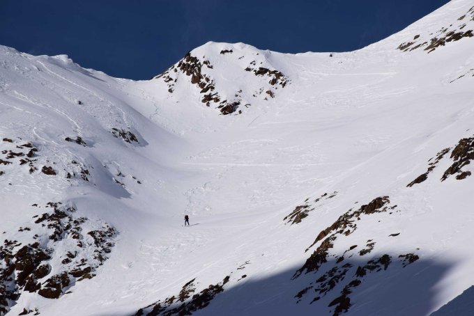 Im Schafleger Pulver, Gipfelhang deutlich windverpresst, deutliche Winderosion. Am Gipfel teilweise orkanartige Windböen. Steine sind gut erkennbar, aber im Vergleich zu den letzten 2 Wochen dank des Neuschnees kaum vorhanden.