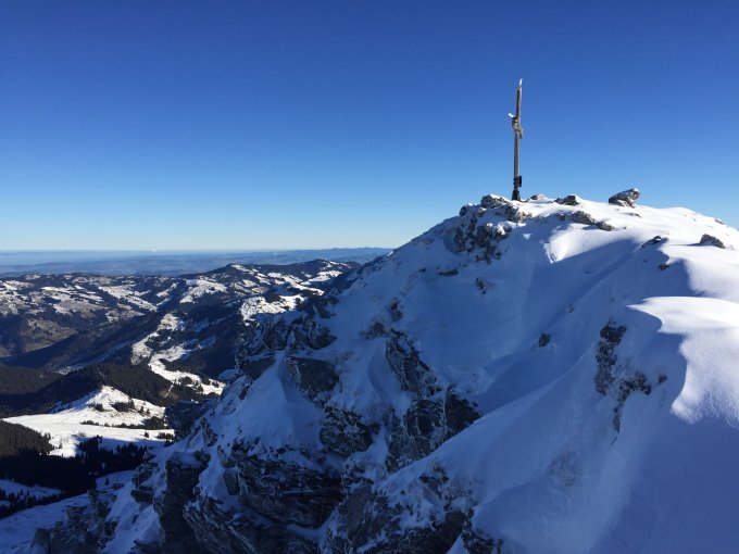 Wenig, aber sehr kompakter Schnee. Direkt unter dem Gipfel auf 2185 m.ü.M (Süd-Ost) hat es sogar noch Pulverschnee.