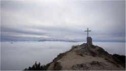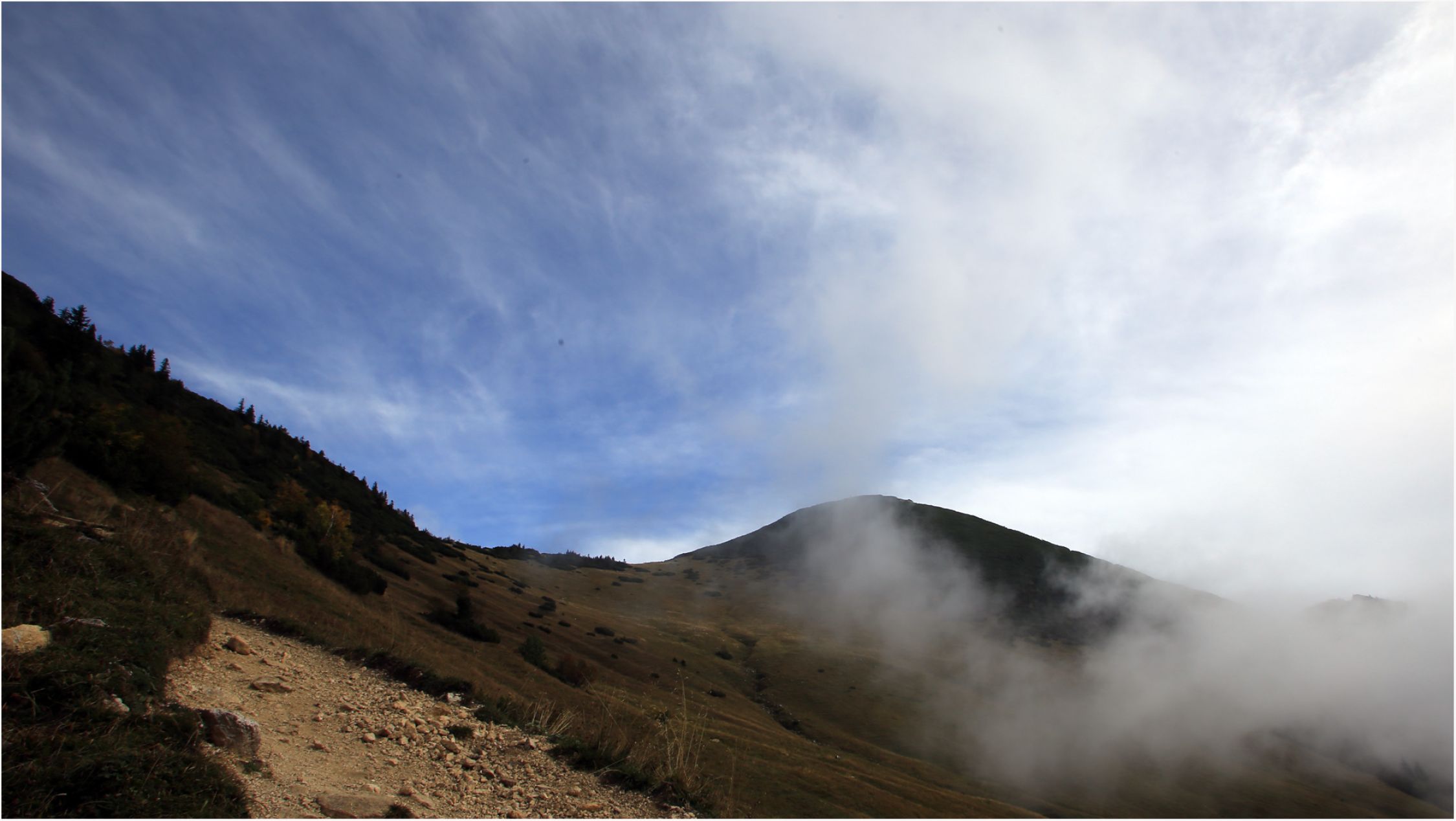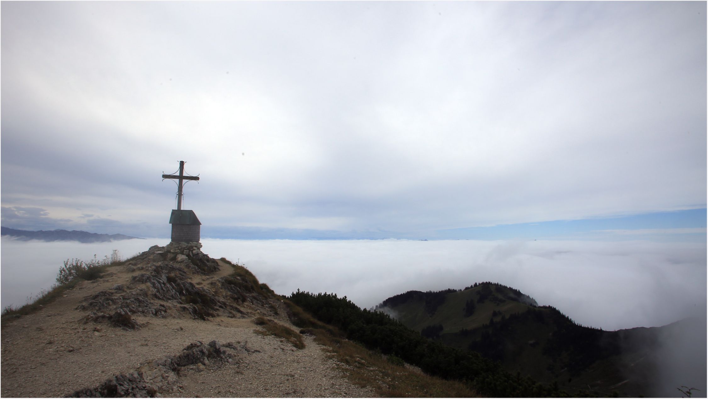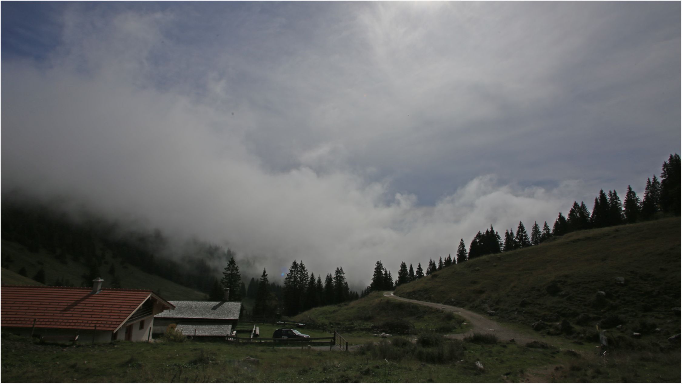 Wolkenobergrenze in Höhe Priener Hütte, Tendenz steigend. Darüber jedoch eine weitere Wolkendecke.
