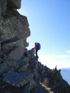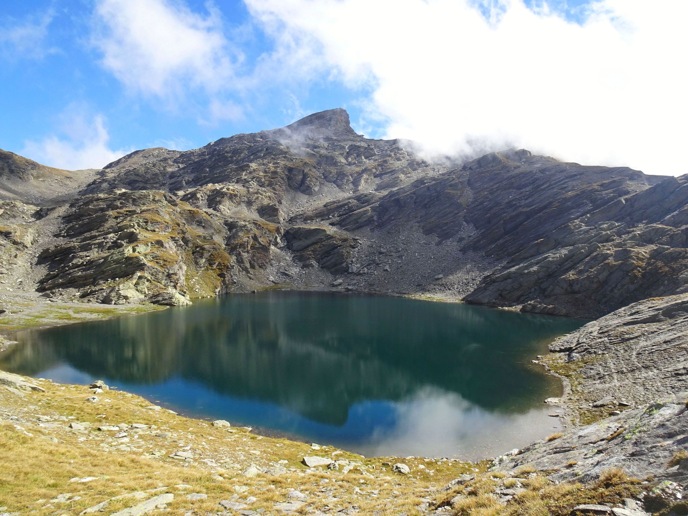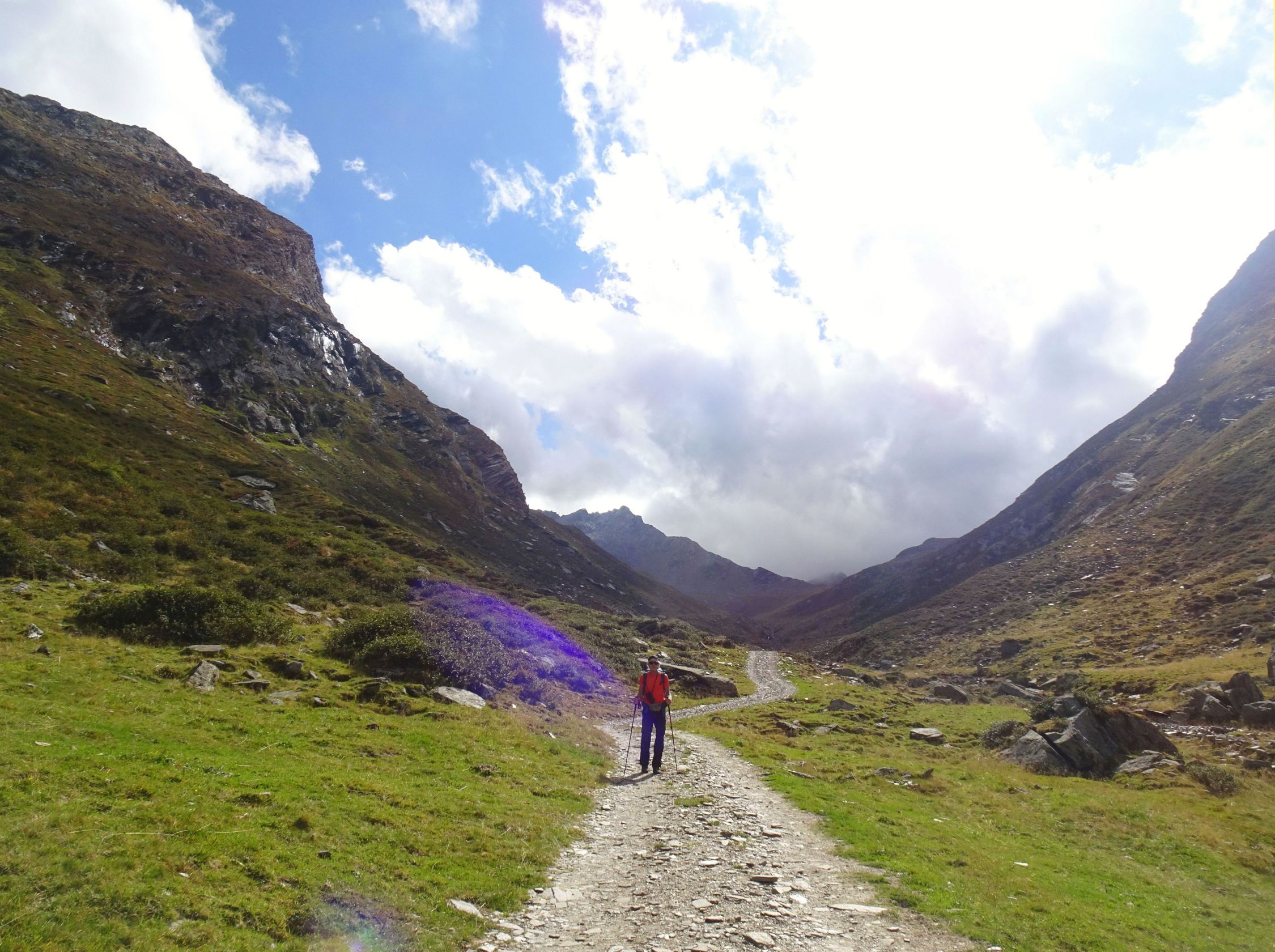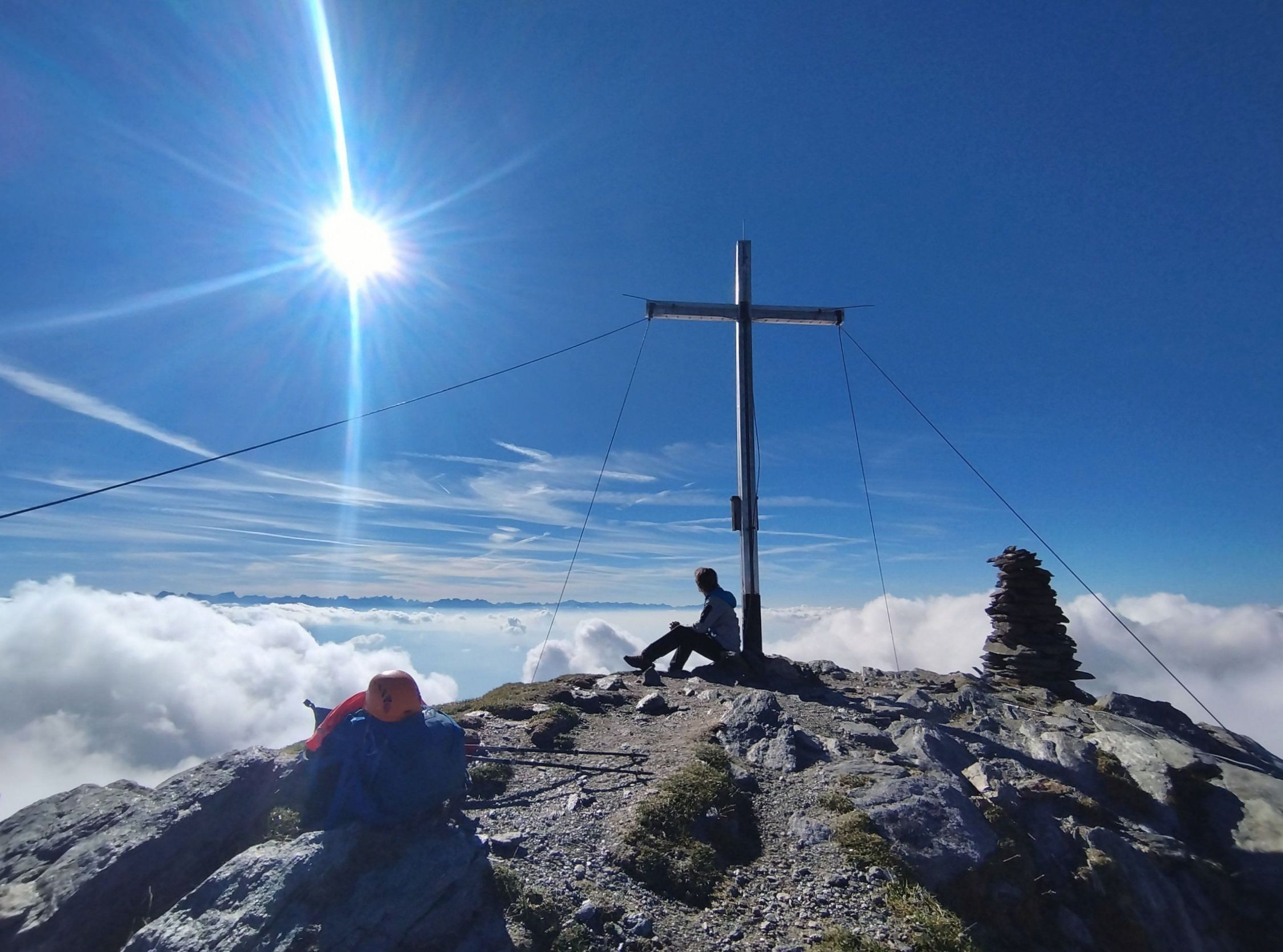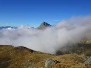 Schwarzkopf: Interessanter Aufstieg am Westkamm in gemäßigtem Gras-Schrofen-Gelände. Die Route zweigt vom Weg zum Spronserjoch ab und ist an einem Felsblock angeschrieben. Abstieg dann am flacheren Normalweg über das Grünjoch (auf den Karten eingezeichnete Route). Heute leider wegen der Quellwolken kein 10-Seen-Blick, dafür Flugzeugperspektive über den Wolken.