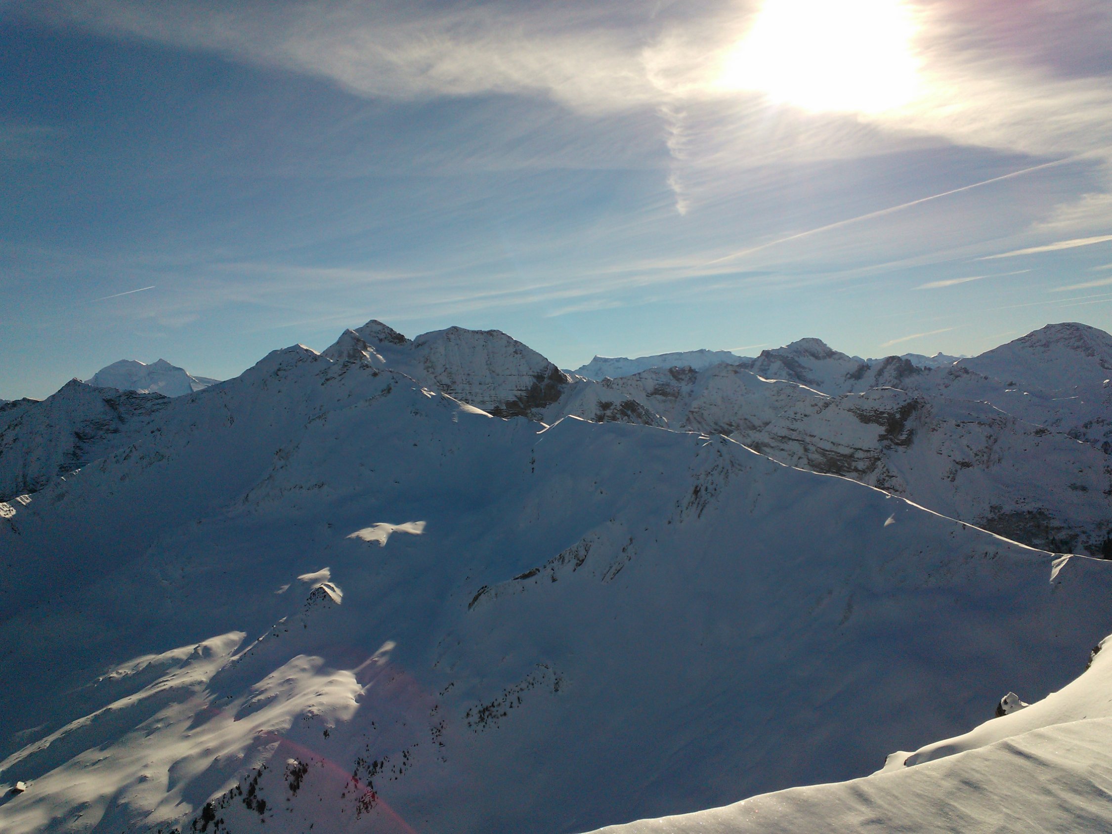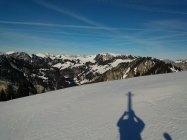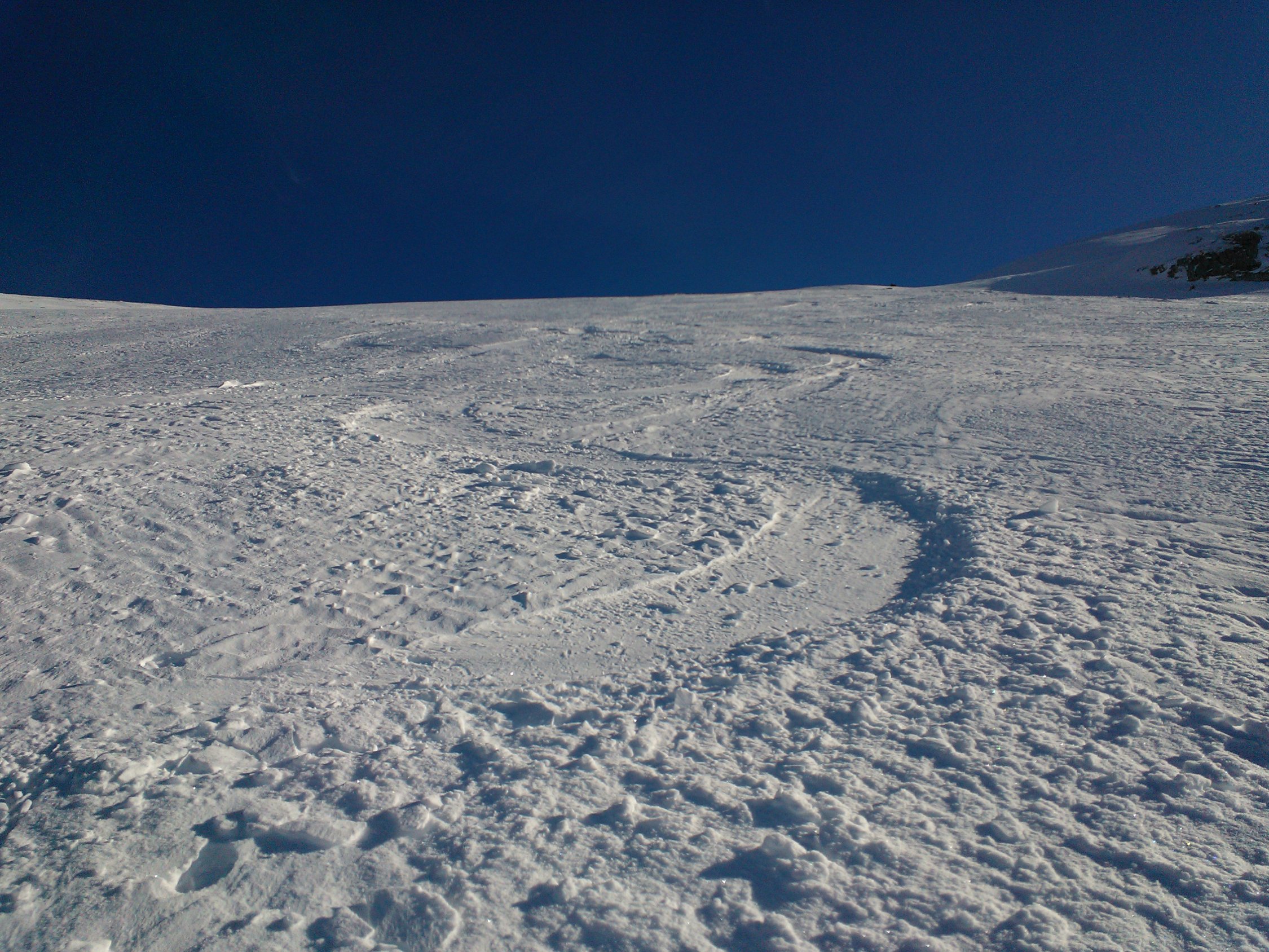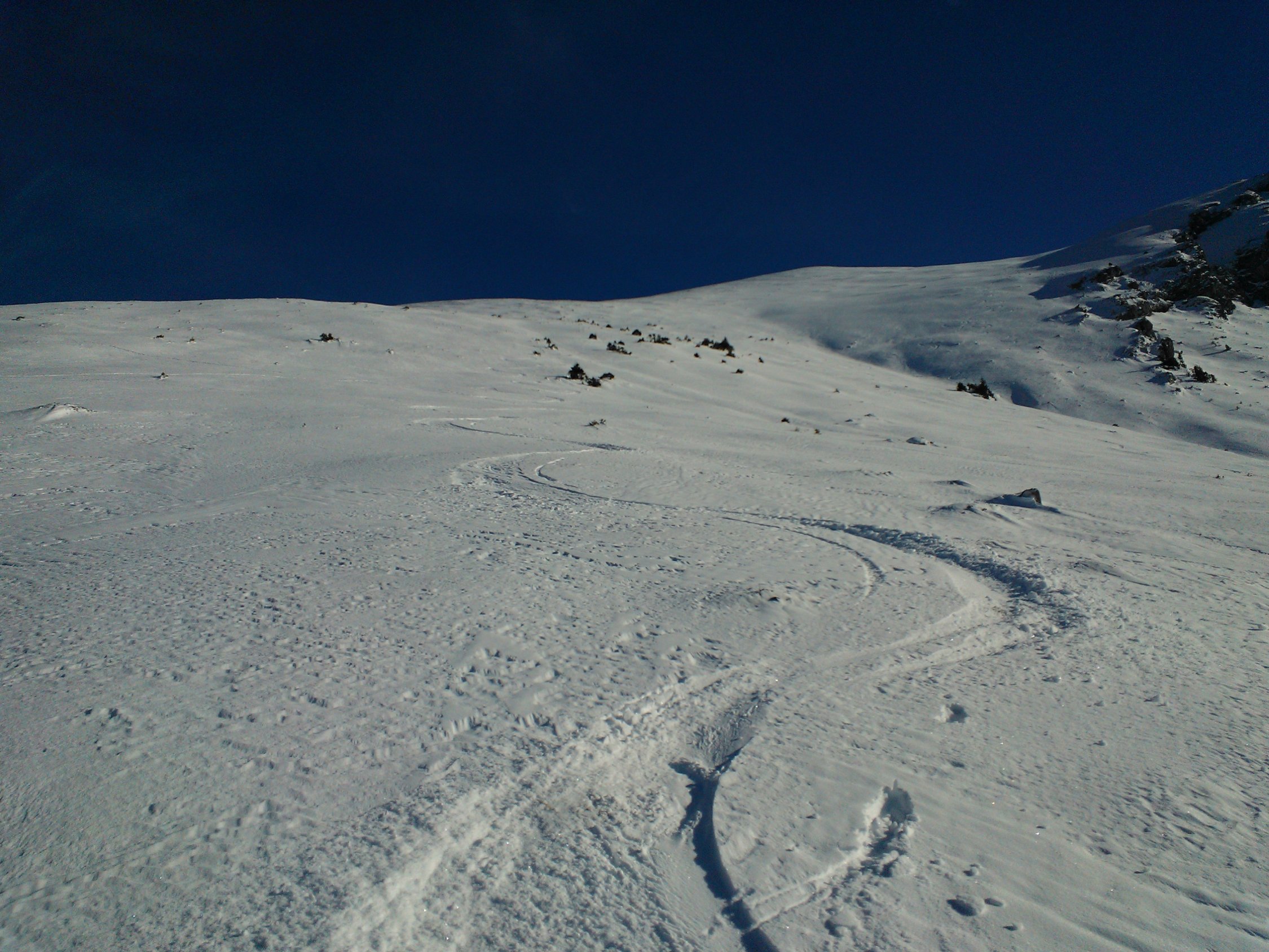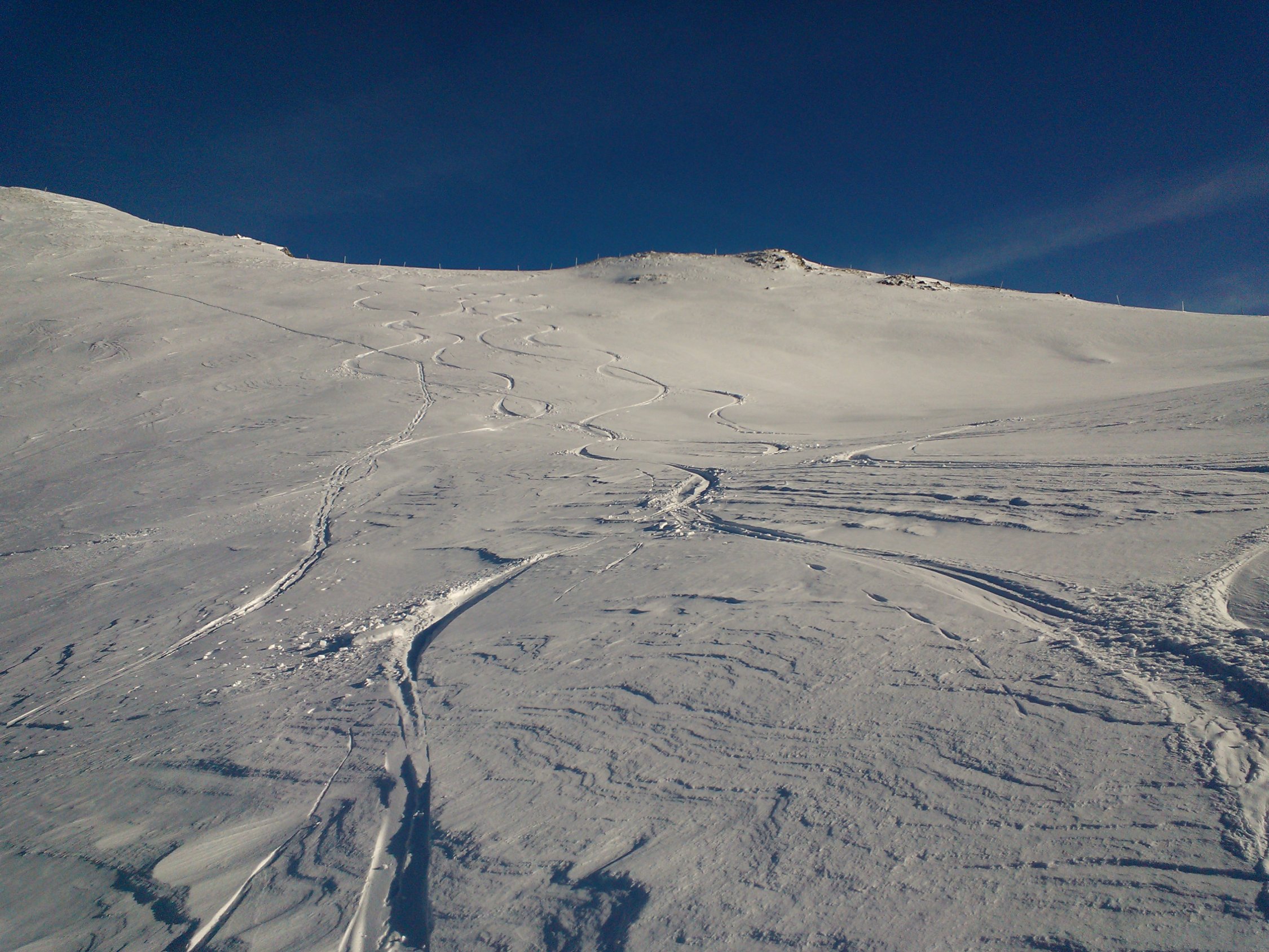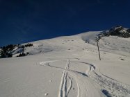 Bei der Anfahrt ins Diemtigtal sah ich, dass die Skilifte am Wiriehorn nicht laufen. Das war die Gelegenheit, diesen Gipfel vom Riedli aus zu begehen, wo er mehr Höhenmeter offeriert! Daher bei Kaiserwetter los, links der Piste hoch. Schnee grad ganz knapp bis unten, wobei: auf der Piste eher Eis statt Schnee. Ein Ratrac bemühte sich, die Sache wieder fahrbar zu machen. Dann weiter bis zum Sattel oberhalb Bodenfluehütte, und von dort via Sommerweg zur Alp Wirie. Diese Route hat den Vorteil, dass man den Steilhang umgeht und vor allem, dass man bei der Abfahrt den ganzen statt nur den halben Schlusshang fahren kann! Sommerweg muss aber lawinensicher sein (siehe Foto). Der Schlusshang war vom Wetter gestaltet, Eisblattern wechselten mit Pulver. Im Aufstieg waren mir die Harscheisen daher wertvoll. Schöne Gipfelrast, war ein netter Thuner Tourengänger oben. Noch zwei Leute im Aufstieg, das wars. Abfahrt: Der Schlusshang war oben pulvrig gut, Mitte wegen des Wechsels Eis-Pulver naja, unten sehr gut. Dann wieder via Sommerweg zur Bodenflue, dort war es super, bisschen Pulver auf harter Unterlage. Und auf der Piste hatte der Ratrac das Eis in einen schönen Teppich verwandelt, das war Klasse. Alles in allem sehr schön.