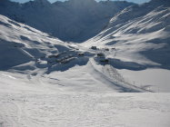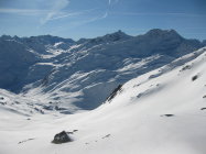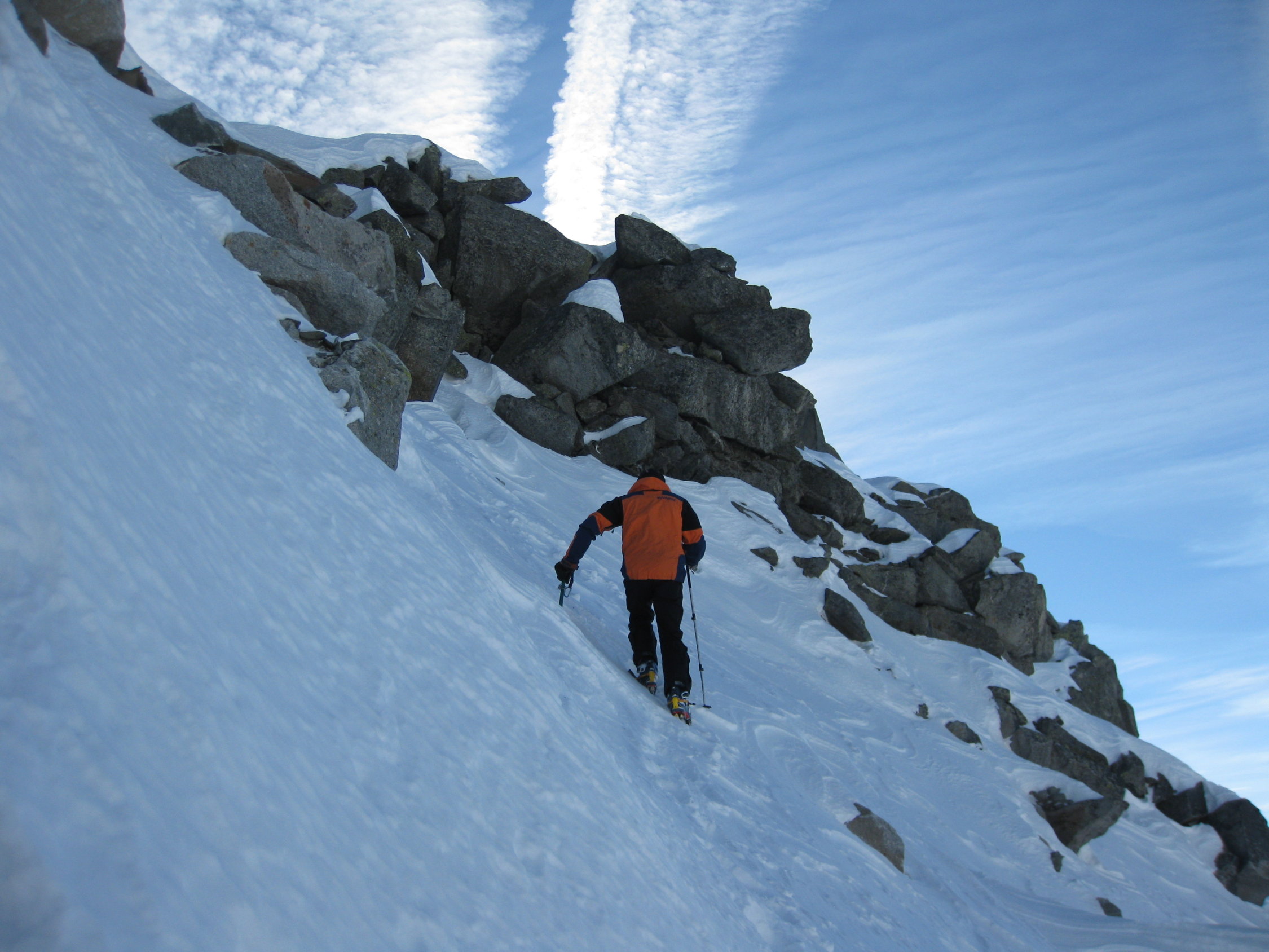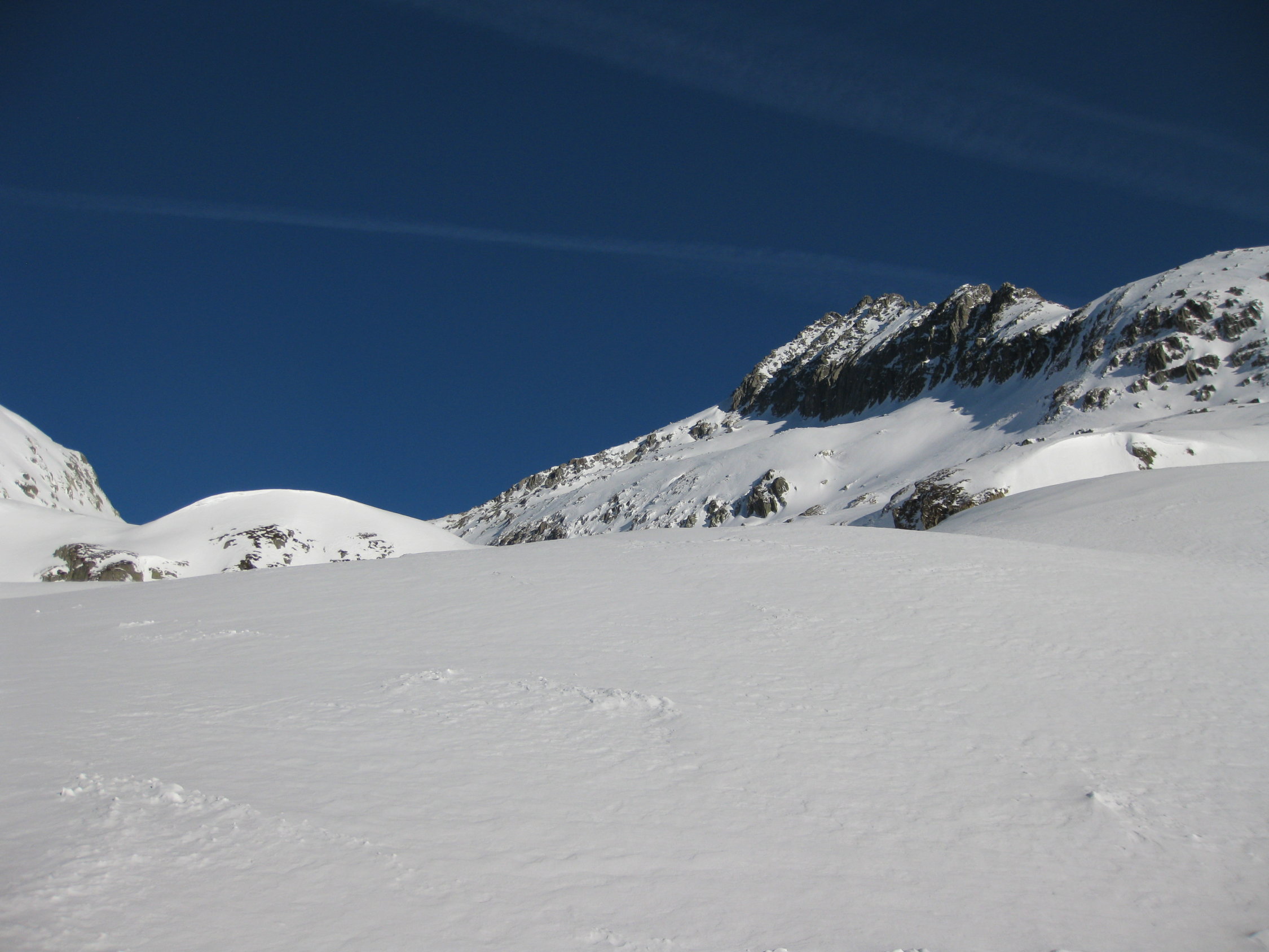 überraschend gute Verhältnisse, überwiegend Pulverschnee bei der Abfahrt, fester Trittschnee am Grat, alleine am Berg