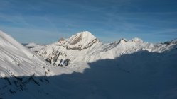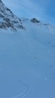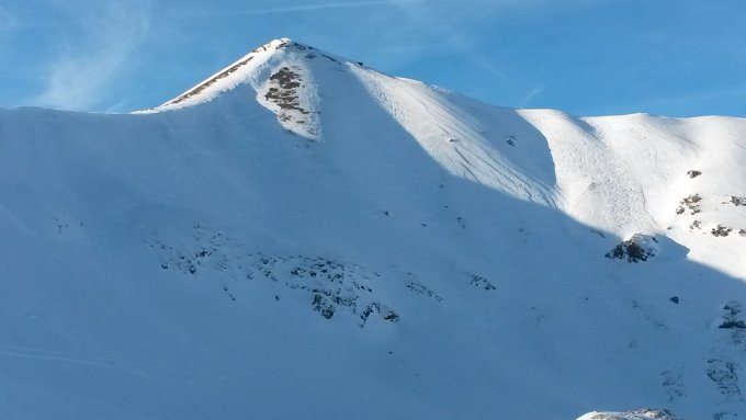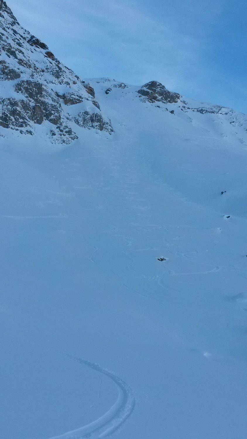 Die Normalabfahrt (Aufstiegsroute) ist schon stark verfahren und man trift alle Schneearten an, Pulver (nur noch wenig), Winddeckel und abgeblasenes Eis.