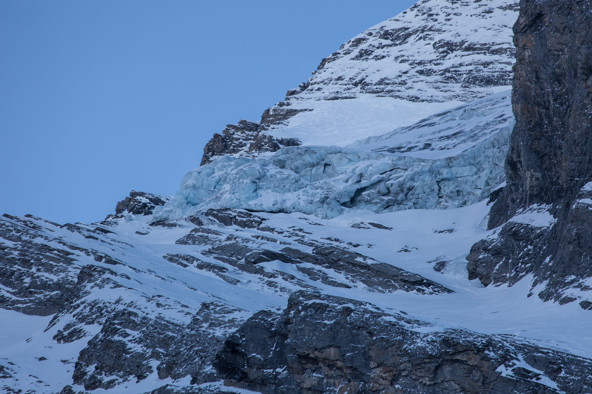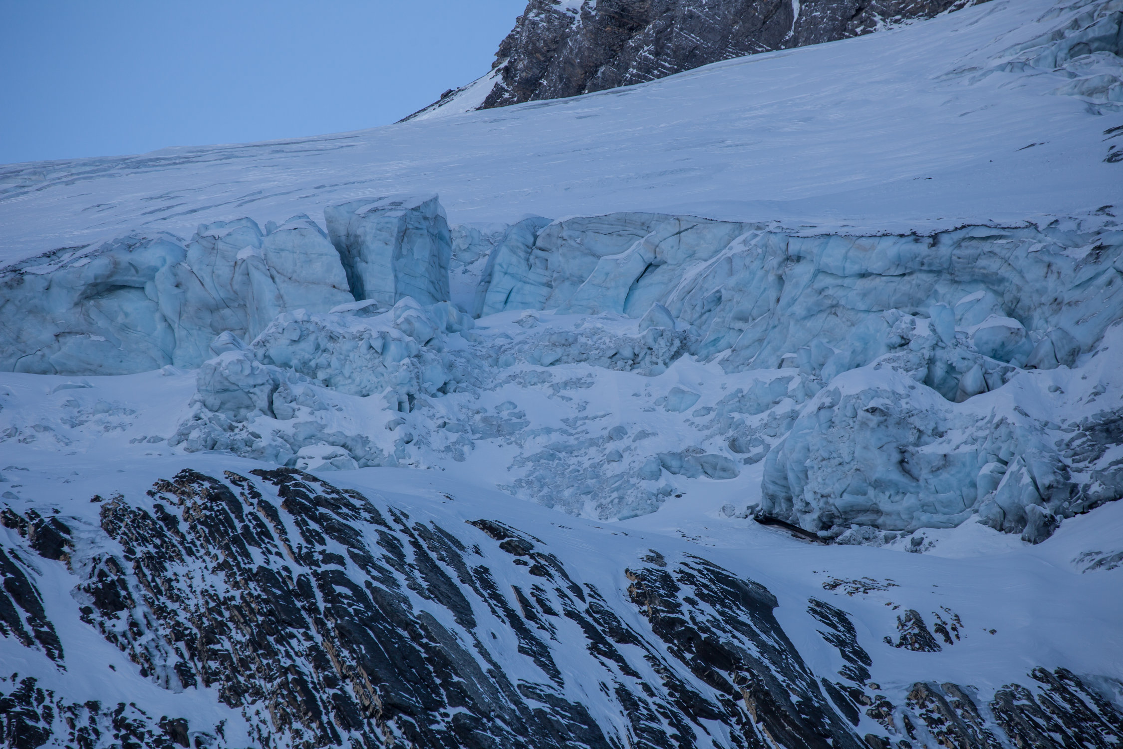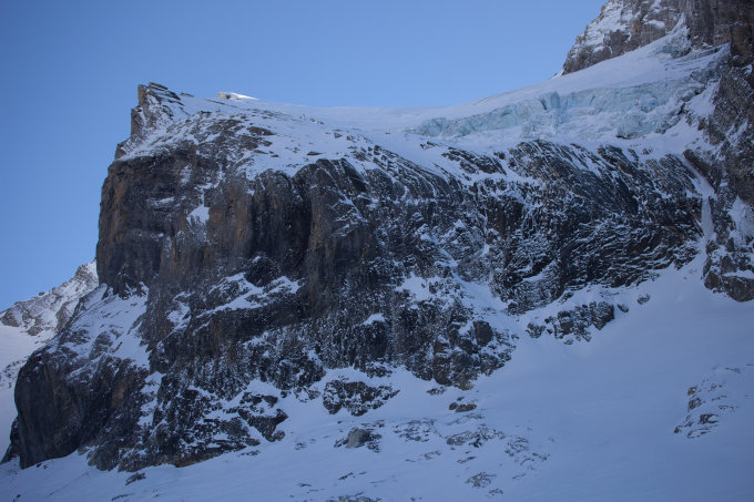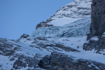 Die beiden Hängegletscher vom Rinderhorn sind stärker zerklüftet als andere Jahre. Schon ein kleiner Eisabbruch könnte im darunterliegenden Steilhang ein Schneebrett auslösen (auch bei Gefahrenstufe 2), welches seinen Auslauf im Bereich der Aufstiegsspur hat. Die Gefahrenzonen liegen im Höhenbereich zwischen 2250 und 2500 Metern. Am besten hier etwas weiter östlich als üblich ansteigen und keine Pausen machen.
