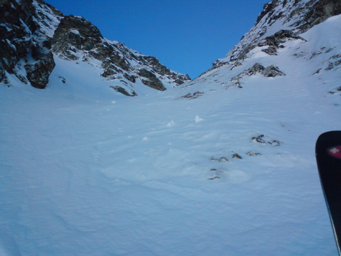gute Verhältnisse. Mit Abstecher in die Nordhänge des Drümännlers. Dort tragende Regenkruste darüber einige cm Pulver bis Umkehrpunkt 2250 m, wo das Nordcouloir zum Gipfel des Drümännlers eng wird.