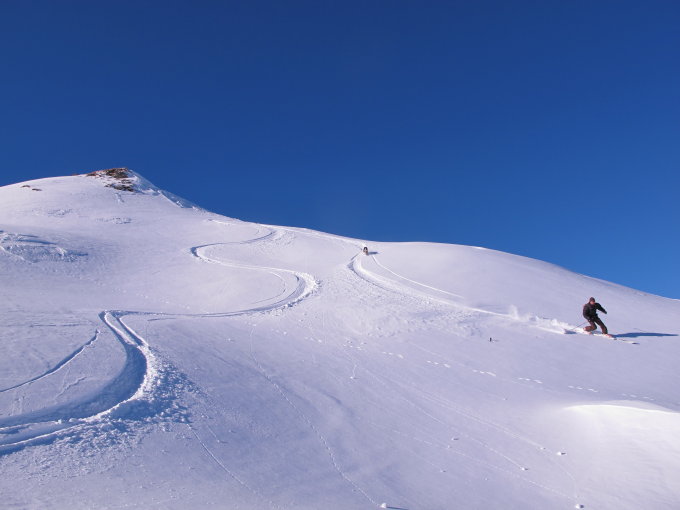 pulver von oben bis unten, in den mulden viel und guter Schnee, wer eine gute Spürnase hat, erwischt eine wunderbare abfahrt. unterhalb der Alphütten auf den heuwiesen runterfahren, da es auf dem alpgelände noch wenig Schnee hat.