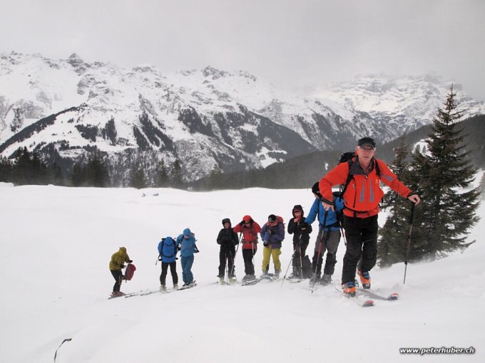 Gegen oben stark zunehmender Wind. Auf der Schulter bei Scheberegg auf 2000 m ca. 100 km/h starker Sturm - Umkehr. Auf der Abfahrt meist schöne Verhältnisse auf dem tragenden Schnee.
