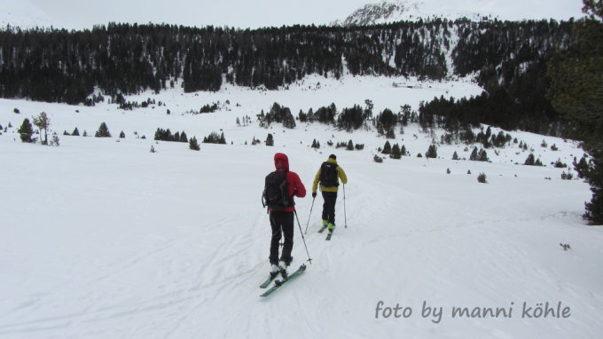 Verhältnisse am Munt Buffalora, alles gut gespurt, viele Abfahrtsspuren (Pistenverhältnisse) und im oberen Bereich auch verblasen. Im unteren Bereich einige Schwünge im Pulverschnee.