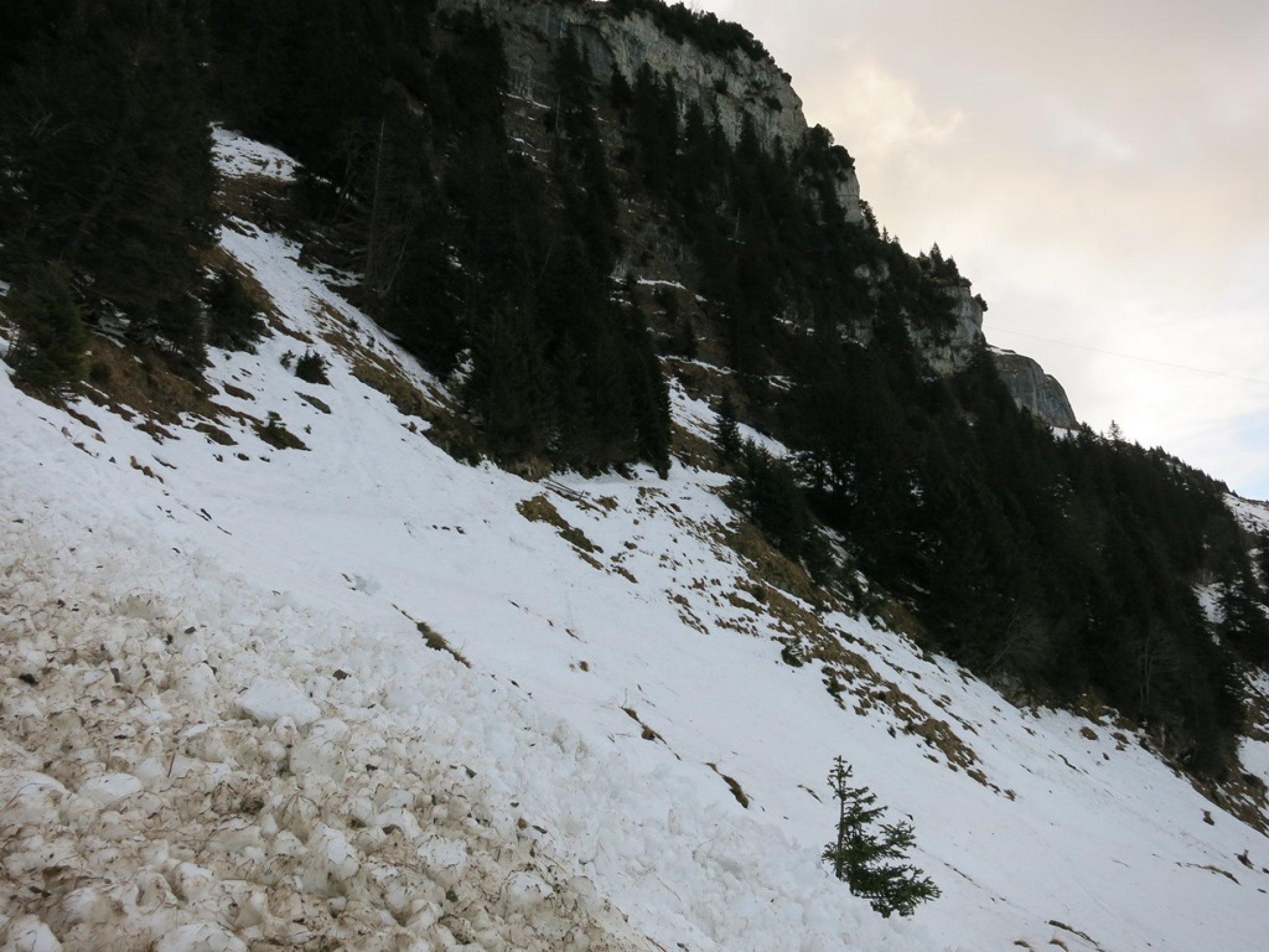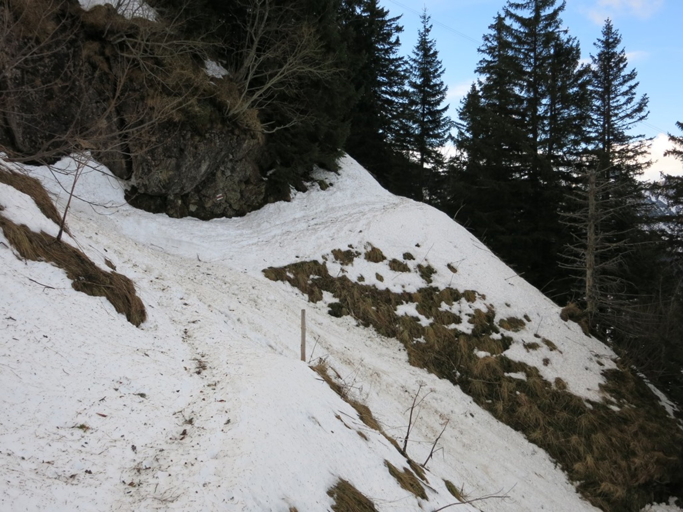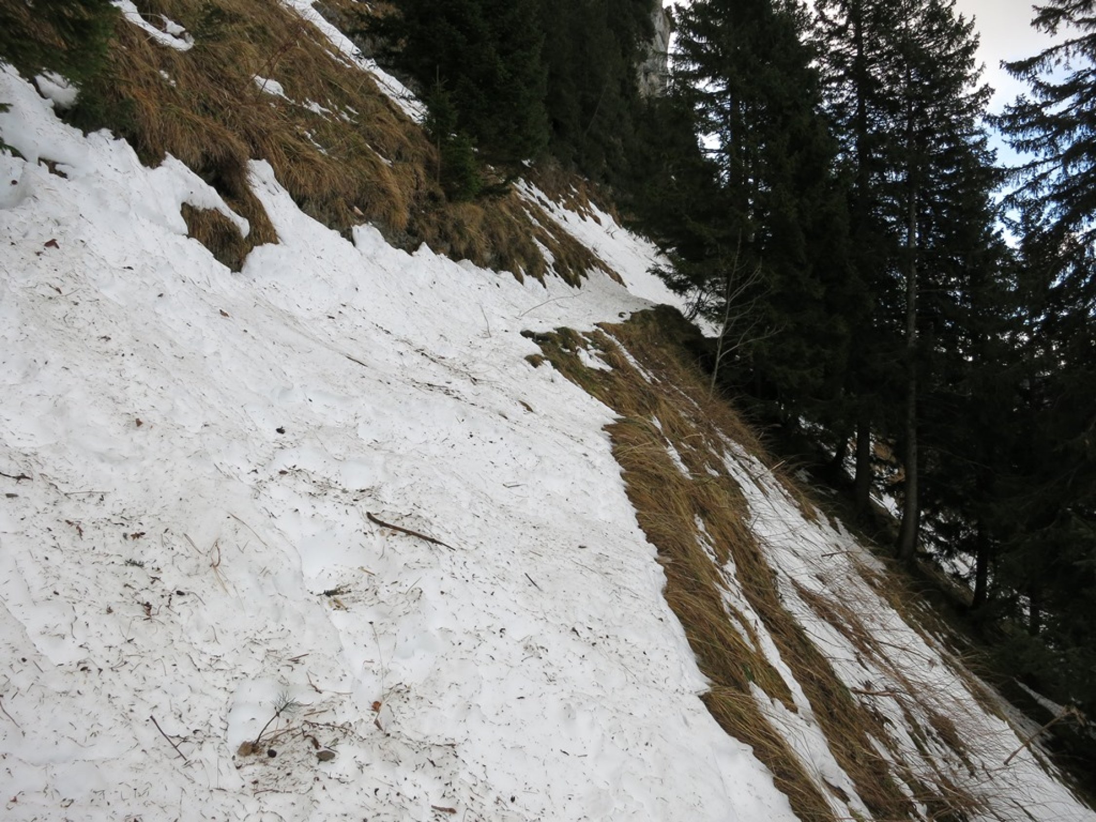 Weiterweg hat dann aufgeweichte Schneedecke oder Eisauflage und teils apere Stellen. Auch sind die Schneerutsche schon unten.
