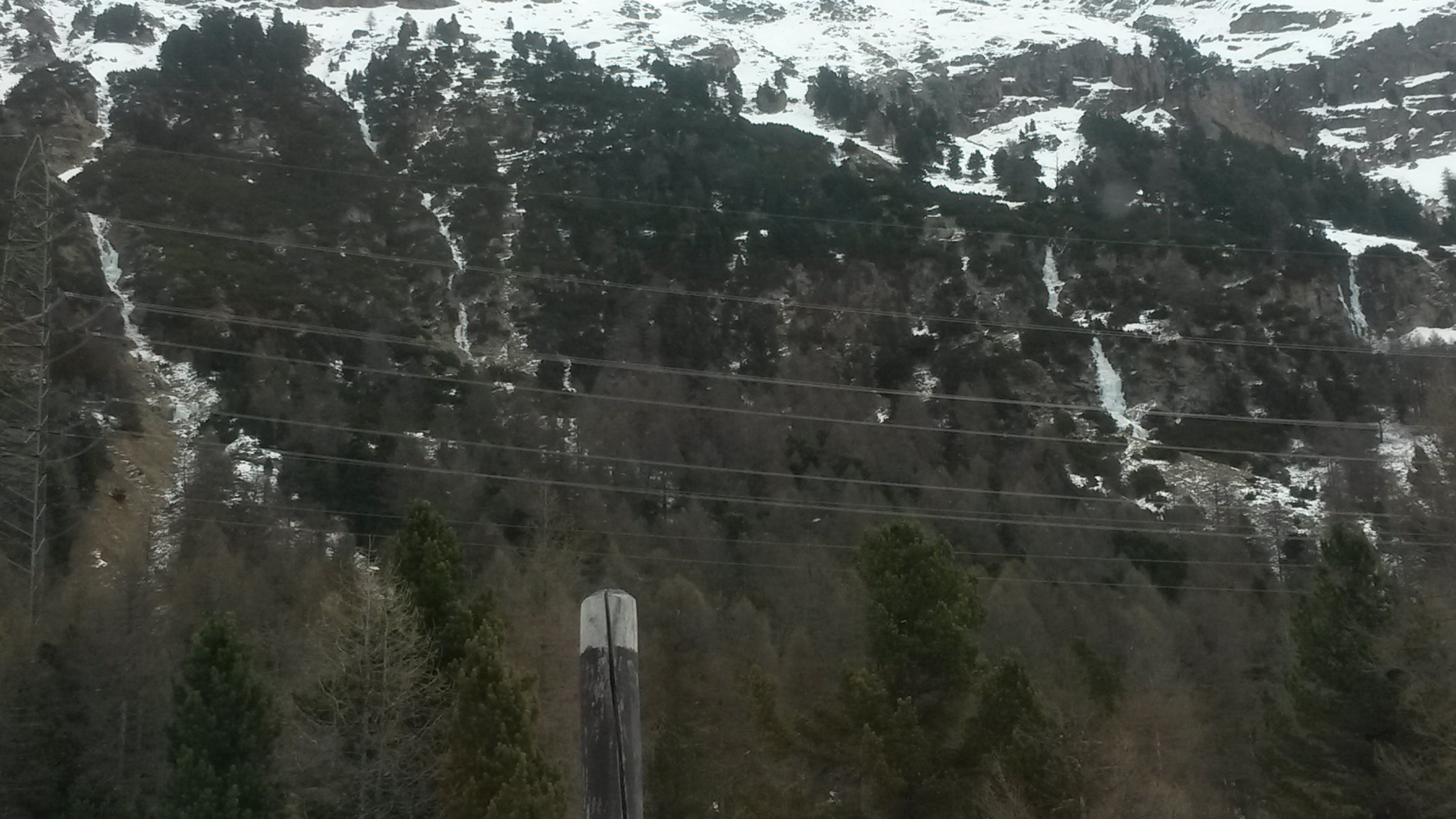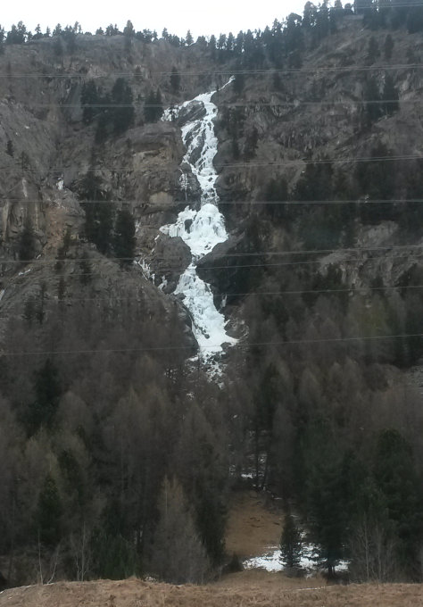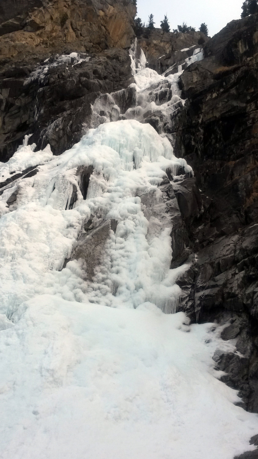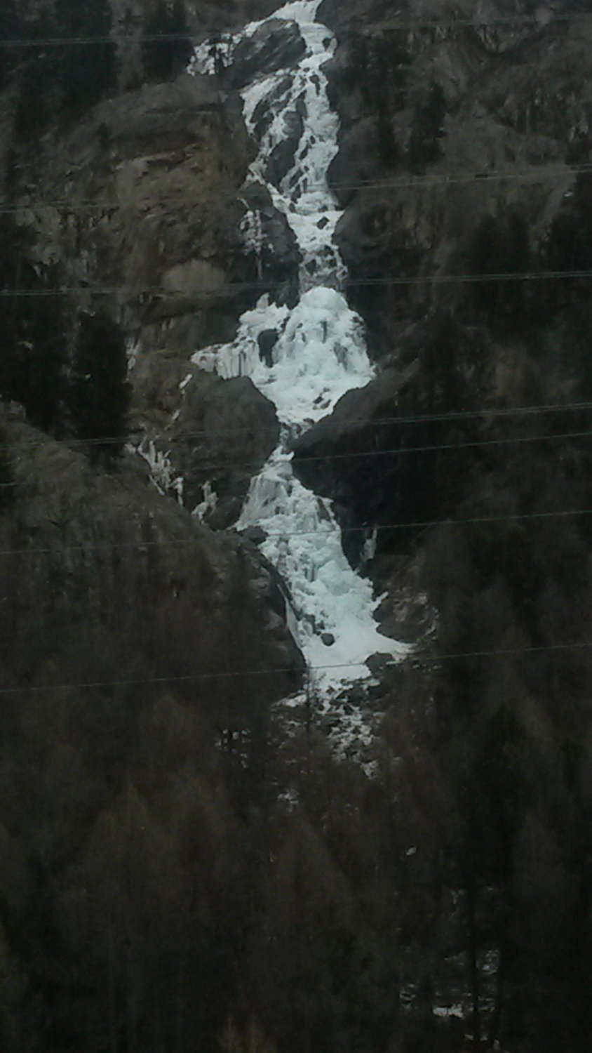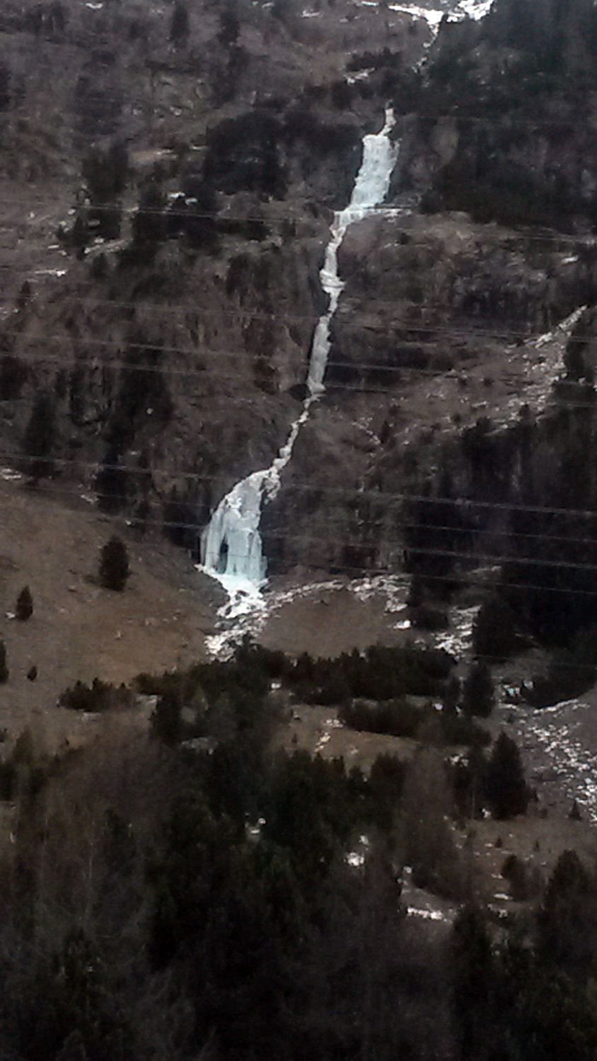 Der Wasserfall ist nicht durchgehend kletterbar. Sonne scheint ab ca. 9:30 in die oberen Bereiche – Eisschlaggefahr. Wir sind die unteren beiden Seillängen geklettert, auch neben der offiziellen Route hat es immer wieder (z. T. gebohrte) Stände. In der dritten Seillänge gibt es einen Abschnitt, der nicht gefroren ist (s. Fotos).