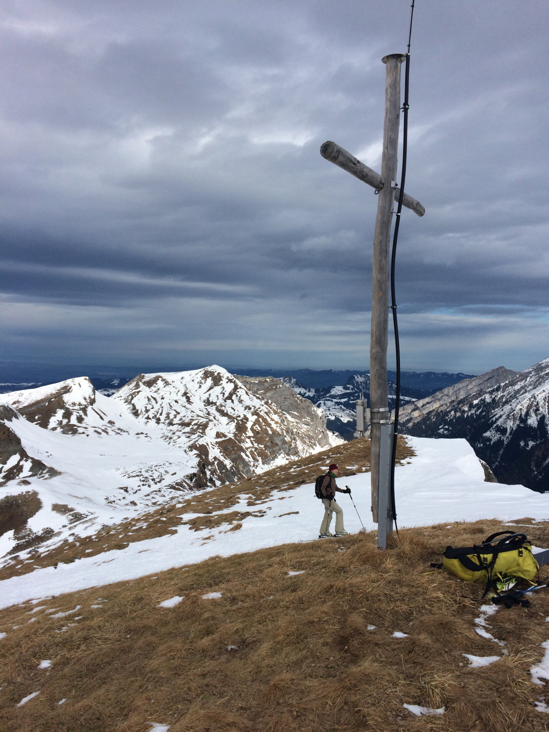 Insgesamt erwartungsgemäss sehr wenig Schnee im Gebiet. Am Parkplatz in Weglosen kann man dennoch direkt Ski anschnallen. Auf der Fahrstrasse zur Druesberghütte zwei kurze Tragepassagen, sonst ok. Dank des Föhn sehr warm. Es ist möglich mit wenig Grasskontakt auf den Gipfel zu kommen mit den Ski und ohne abzuschnallen.